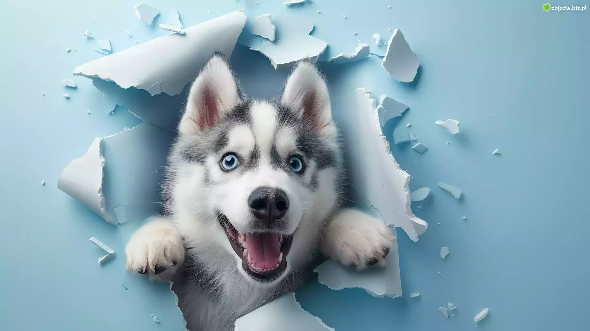 Zdjęcie Pies, Siberian husky, Dziura, Ściana, Niebieska