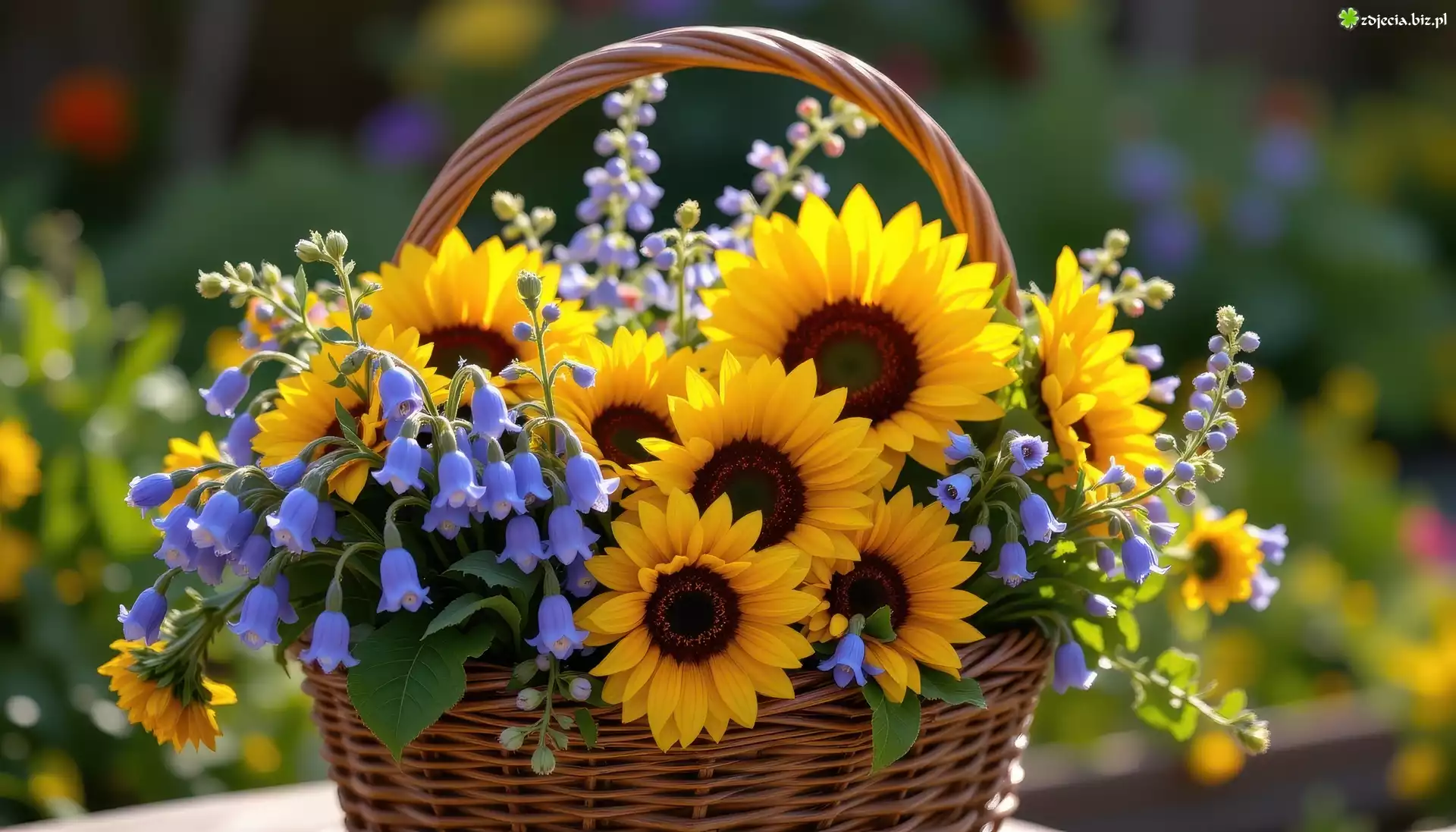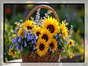 Zdjęcie Kwiaty, Słoneczniki, Niebieskie, Dzwonki, Wiklinowy, Koszyk
