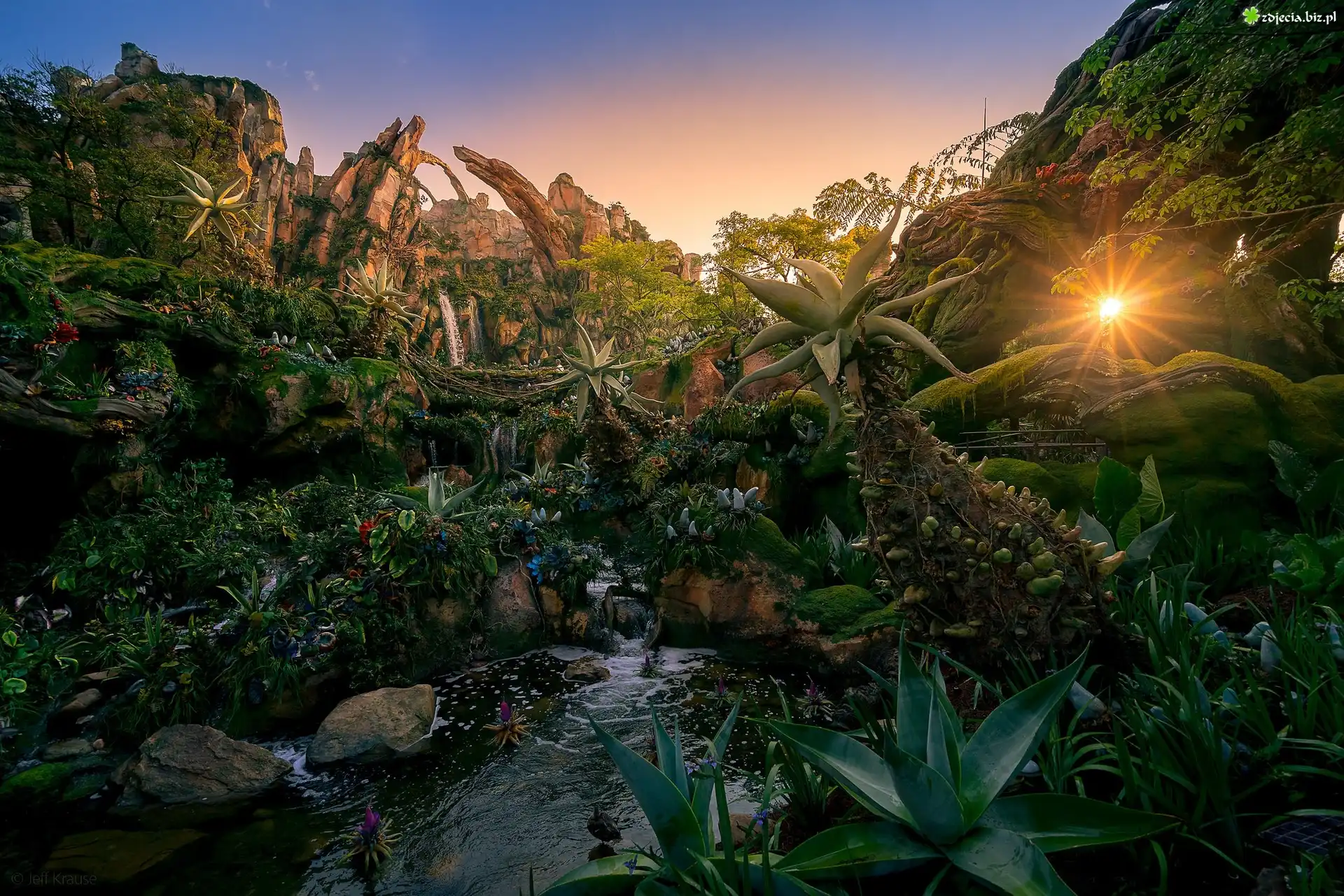 Zdjęcie Egzotyczny, Ogród, Kwiaty, Skały, Wschód słońca
