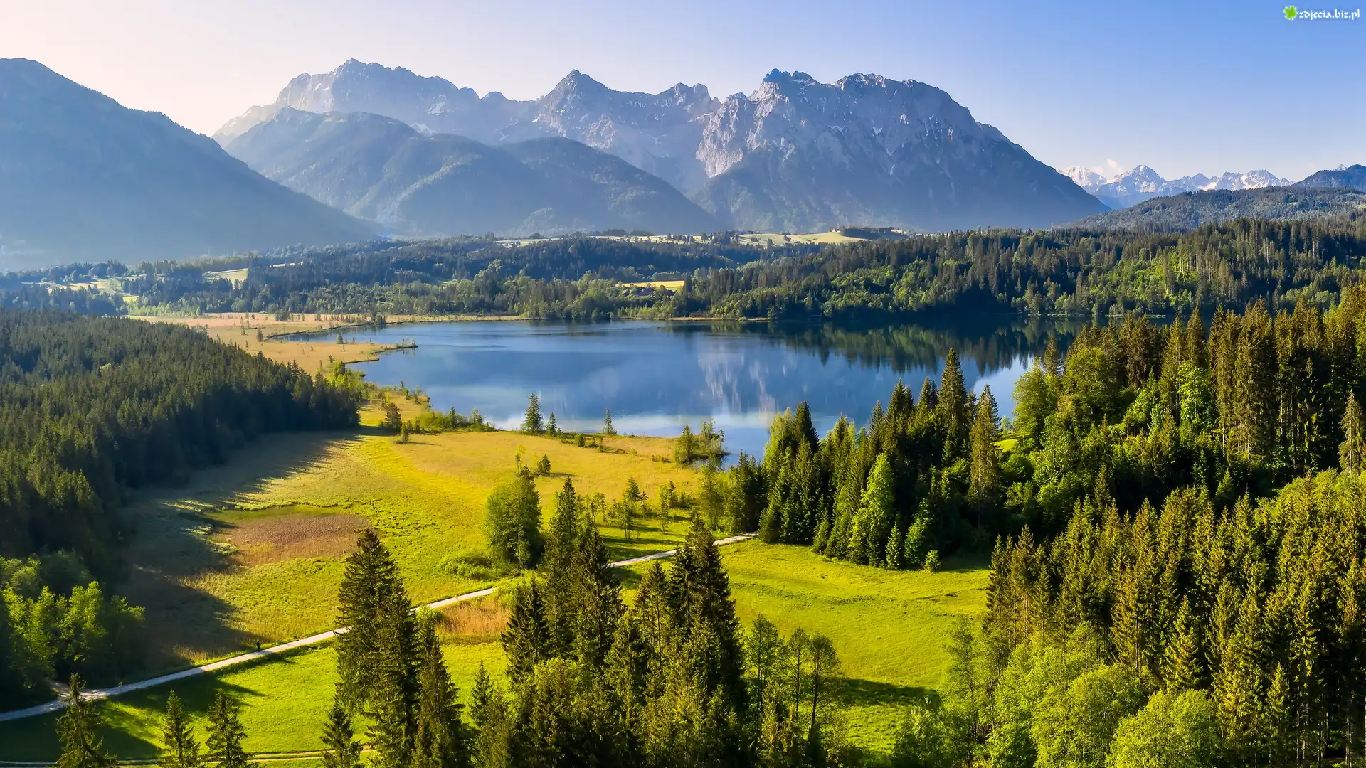 Zdjęcie, Jezioro Eibsee, Góry, Karwendel, Drzewa, Lasy, Bawaria, Niemcy