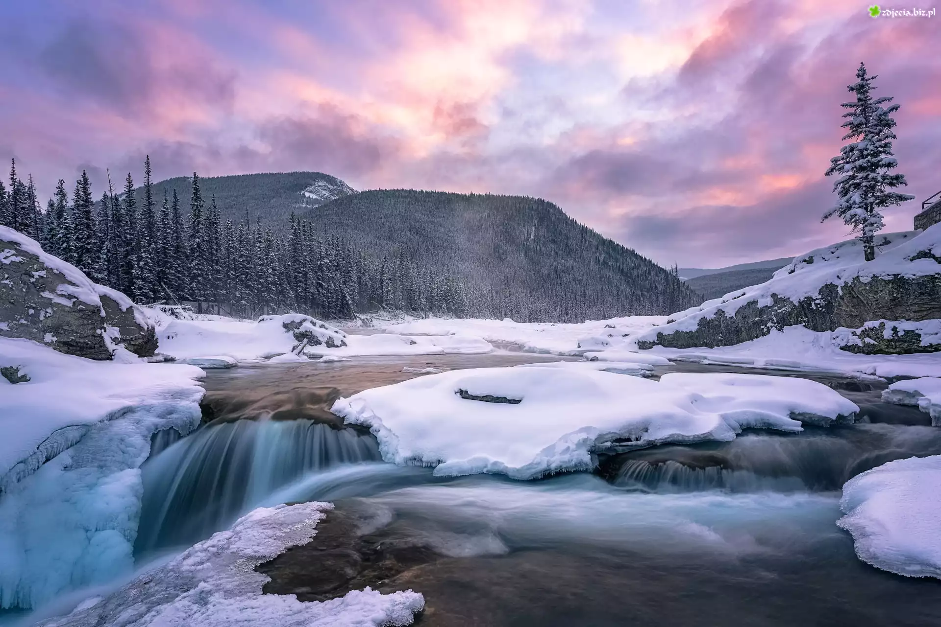 Zdjęcie, Elbow Falls, Rzeka Elbow, Zima, Lód, Góry, Drzewa, Zachód słońca, Prowincja Alberta, Kanada