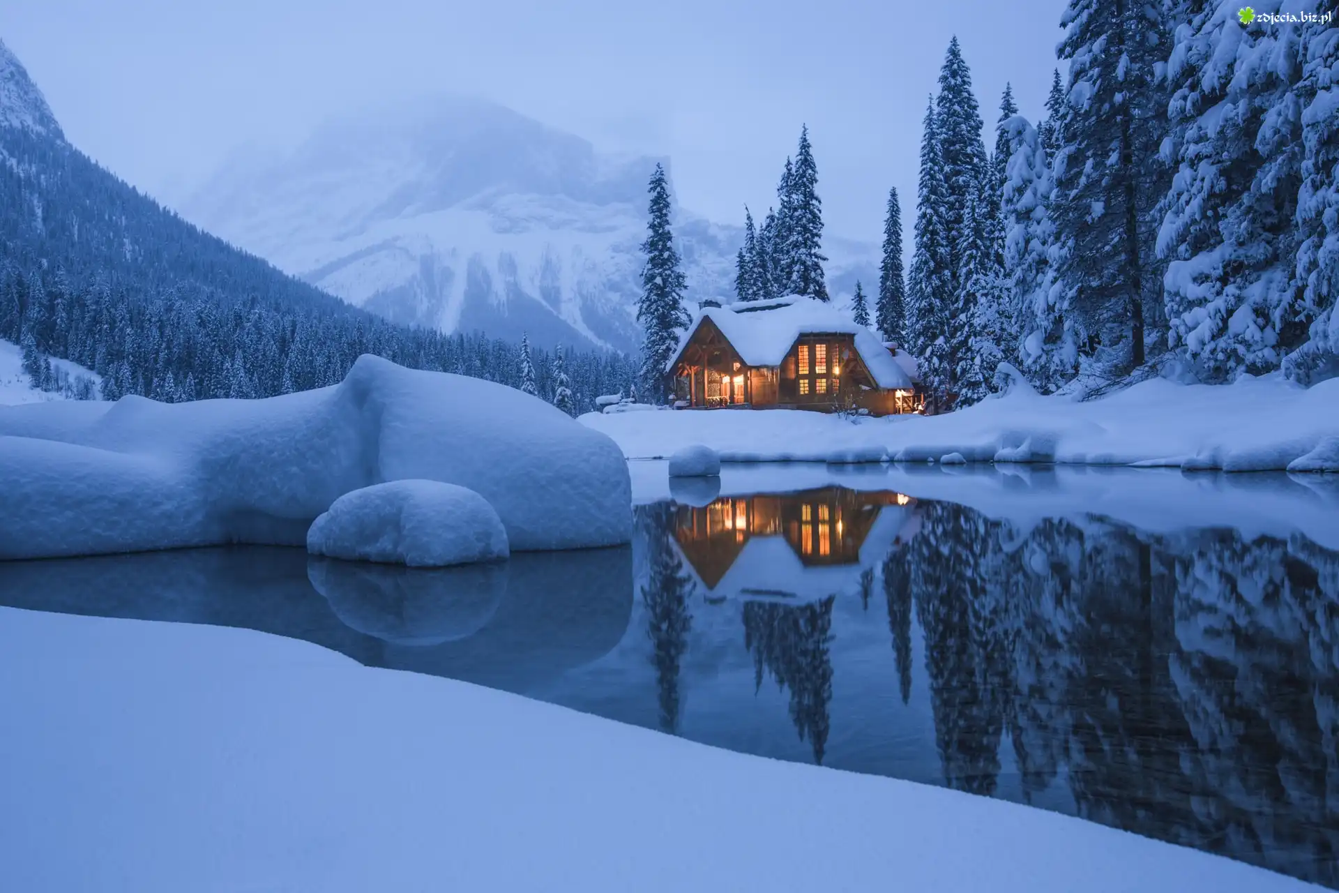 Zdjęcie Park Narodowy Yoho, Jezioro, Emerald Lake, Śnieg, Drzewa, Góry, Mgła, Chmury, Dom, Zima, Kanada |
