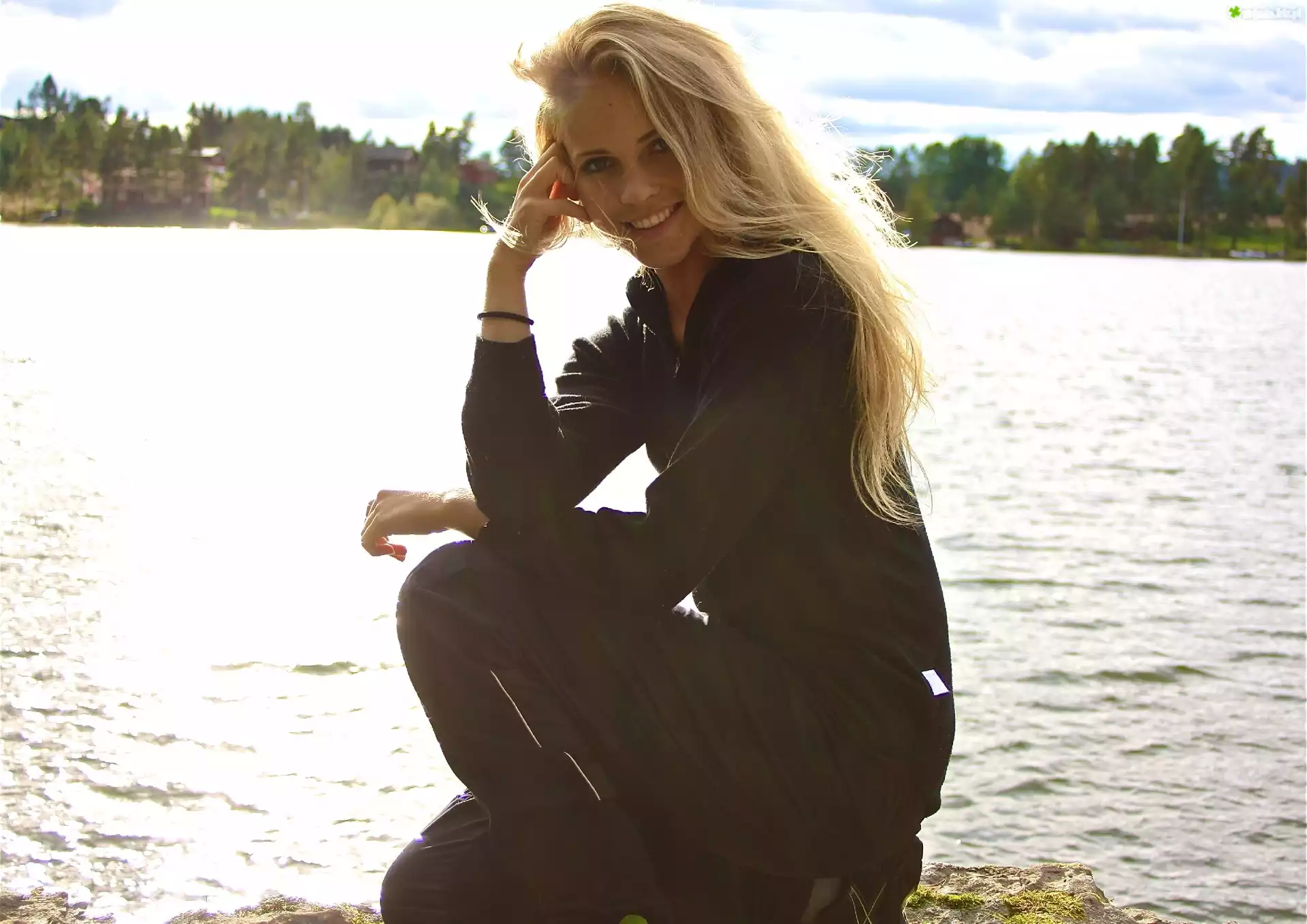 Zdjęcie, Emilie Marie Nereng, Blondynka, Uśmiech, Jezioro