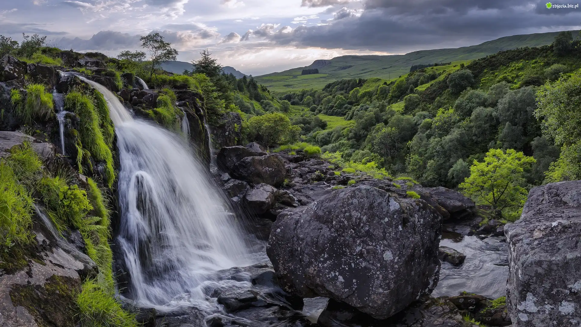 Zdjęcie Szkocja, Hrabstwo Stirlingshire, Góry, Rzeka Endrick, Wodospad Loup of Fintry, Kamienie, Roślinność |
