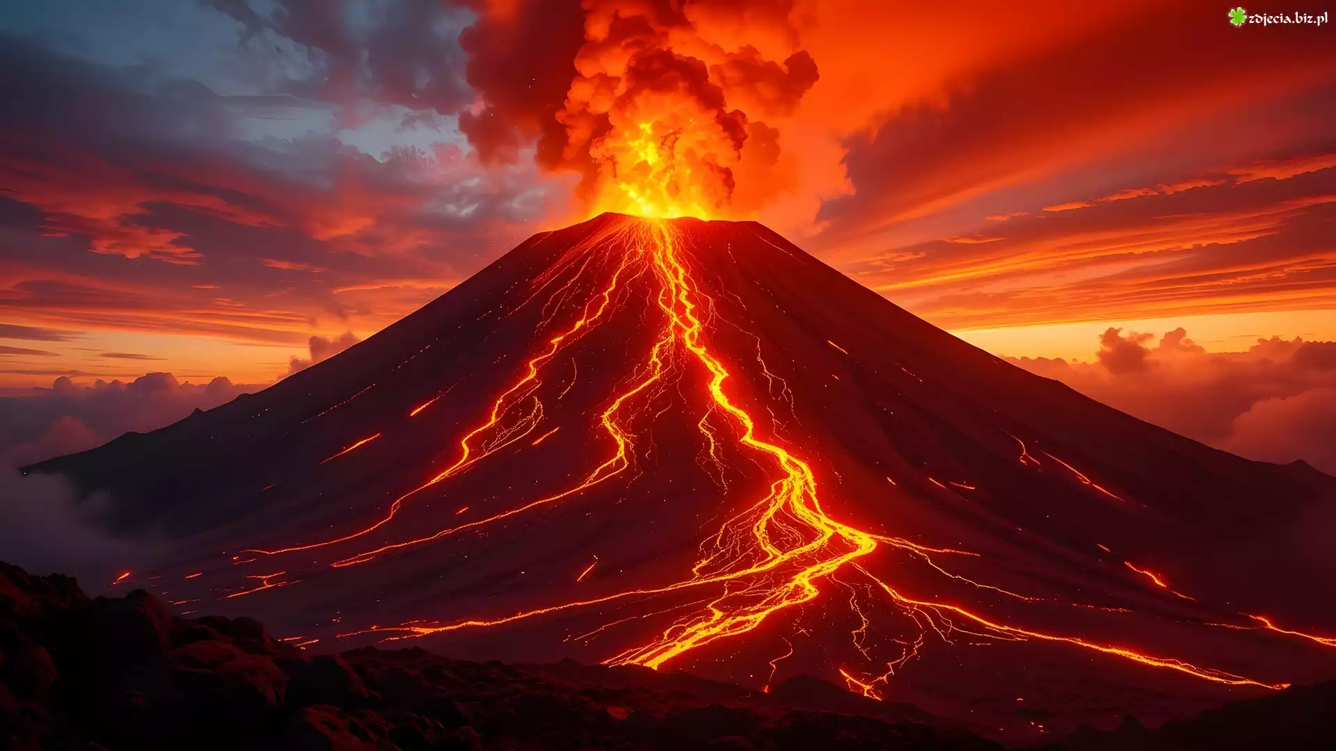 Zdjęcie Zachód słońca, Wulkan, Erupcja, Ogień, Dym, Grafika