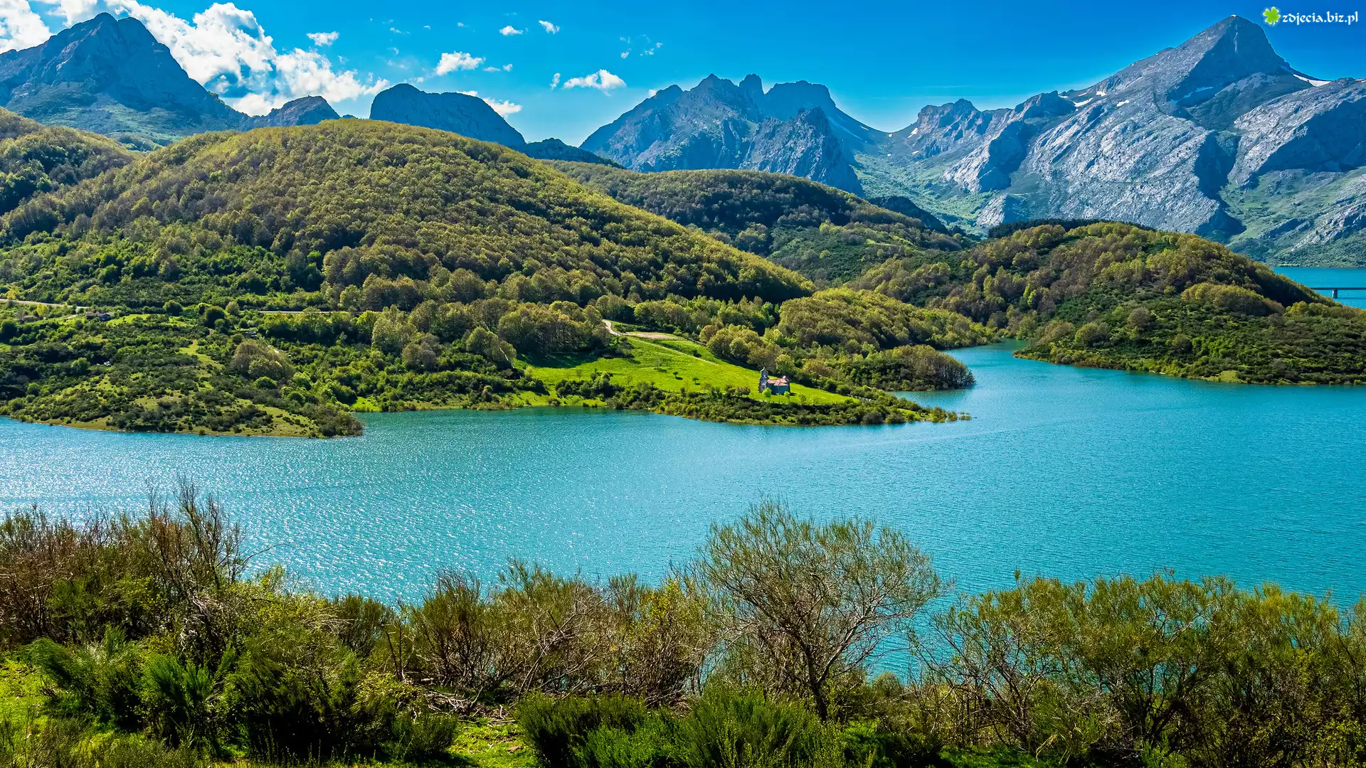 Zdjęcie Hiszpania, Jezioro Embalse, Drzewa, Góry, Picos de Europa