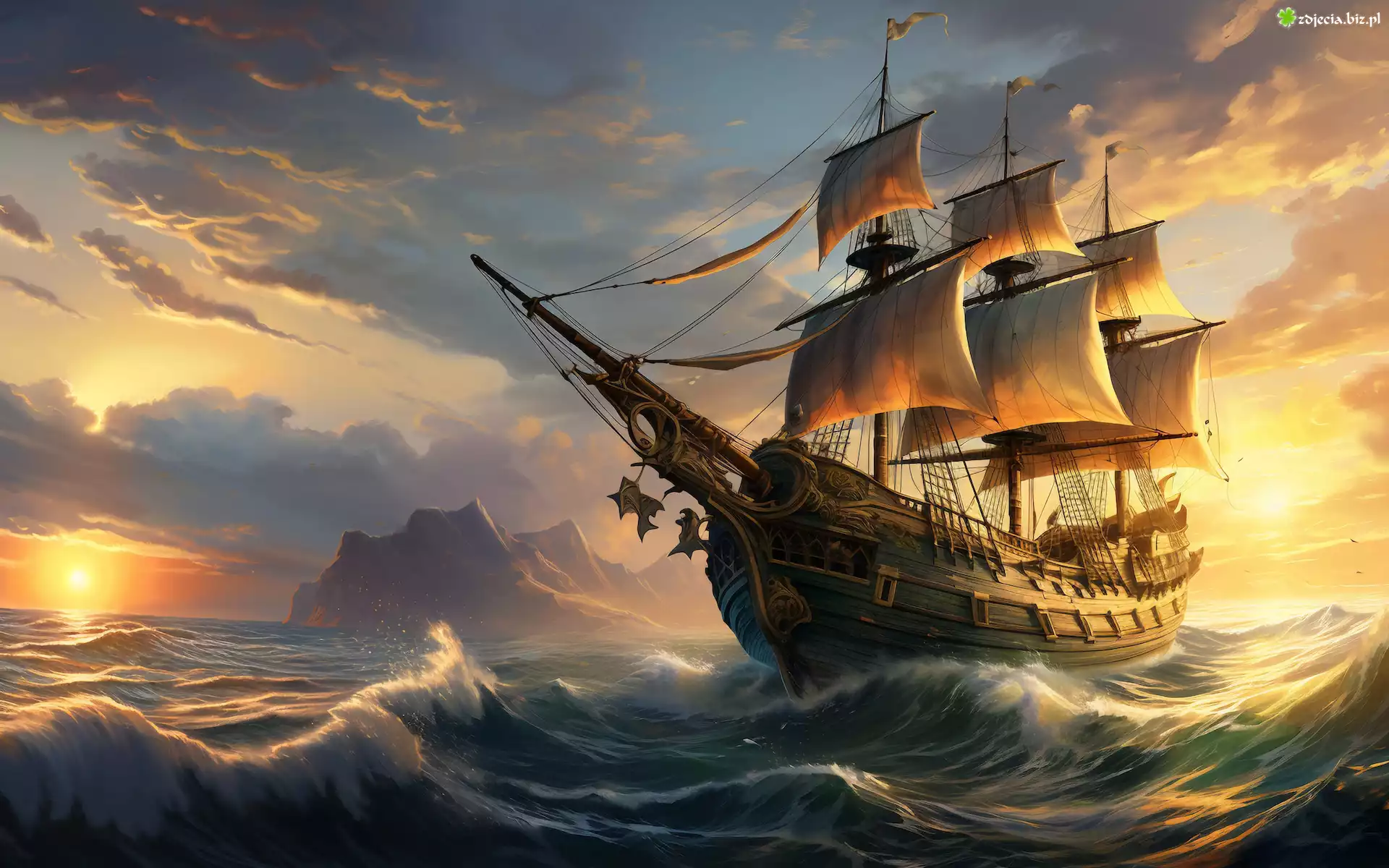 Zdjęcie Grafika, Żaglowiec, Morze, Fale, Promienie słońca, Góry