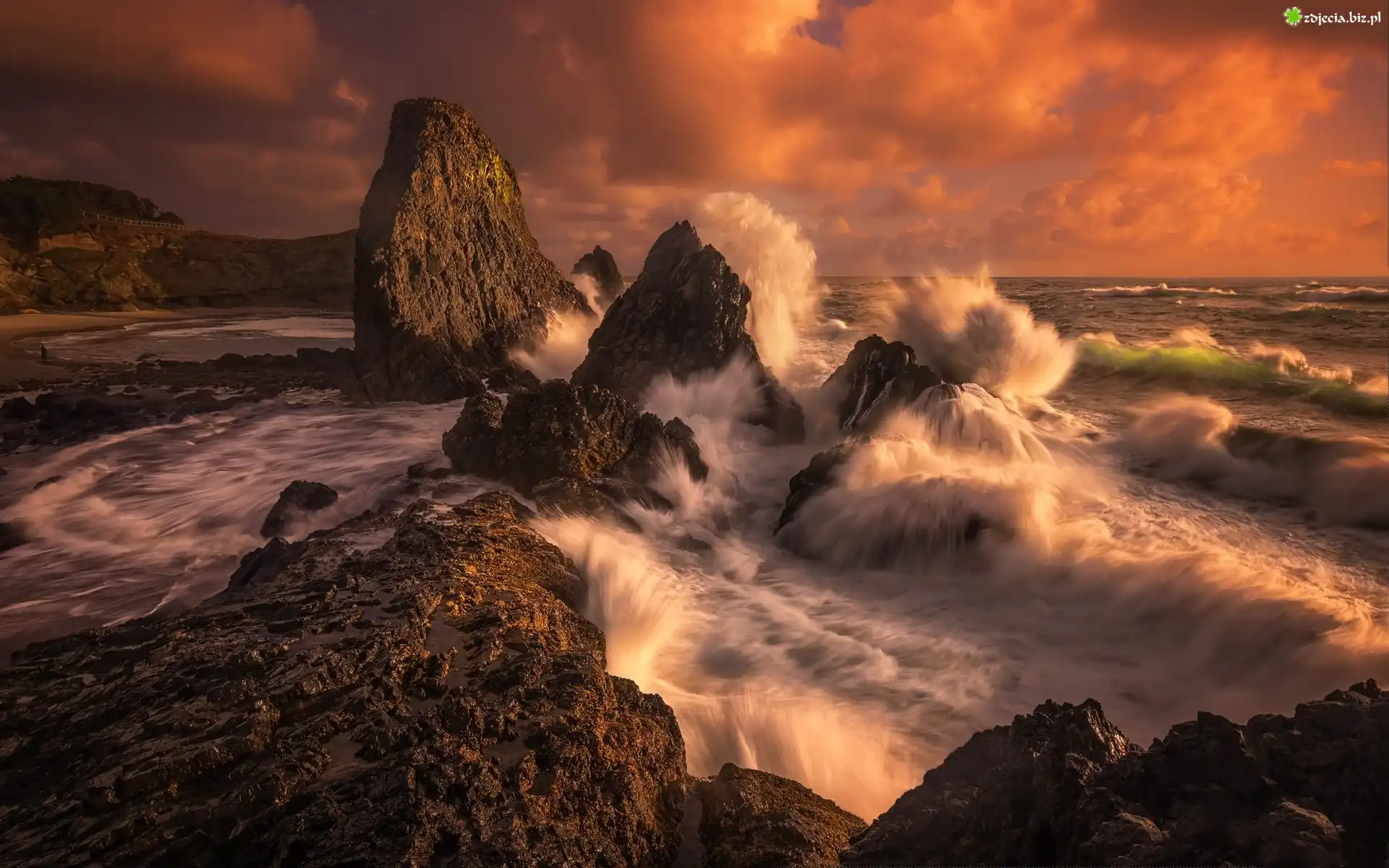 Zdjęcie Fale, Morze, Skały, Zachód słońca