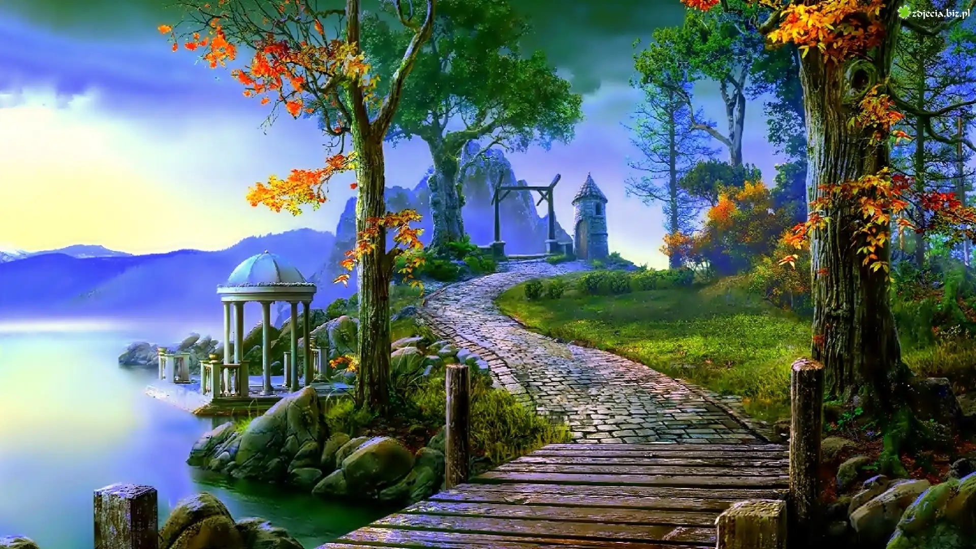 Zdjęcie Fantasy, Jezioro, Góry, Drzewa, Schody
