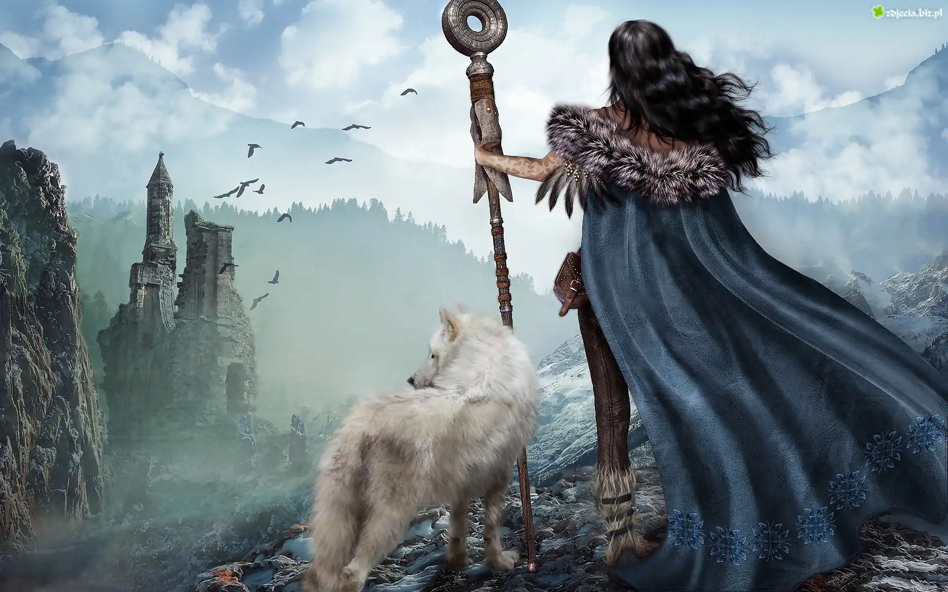 Zdjęcie Fantasy, Dziewczyna, Biały, Wilk, Góry, Ruiny