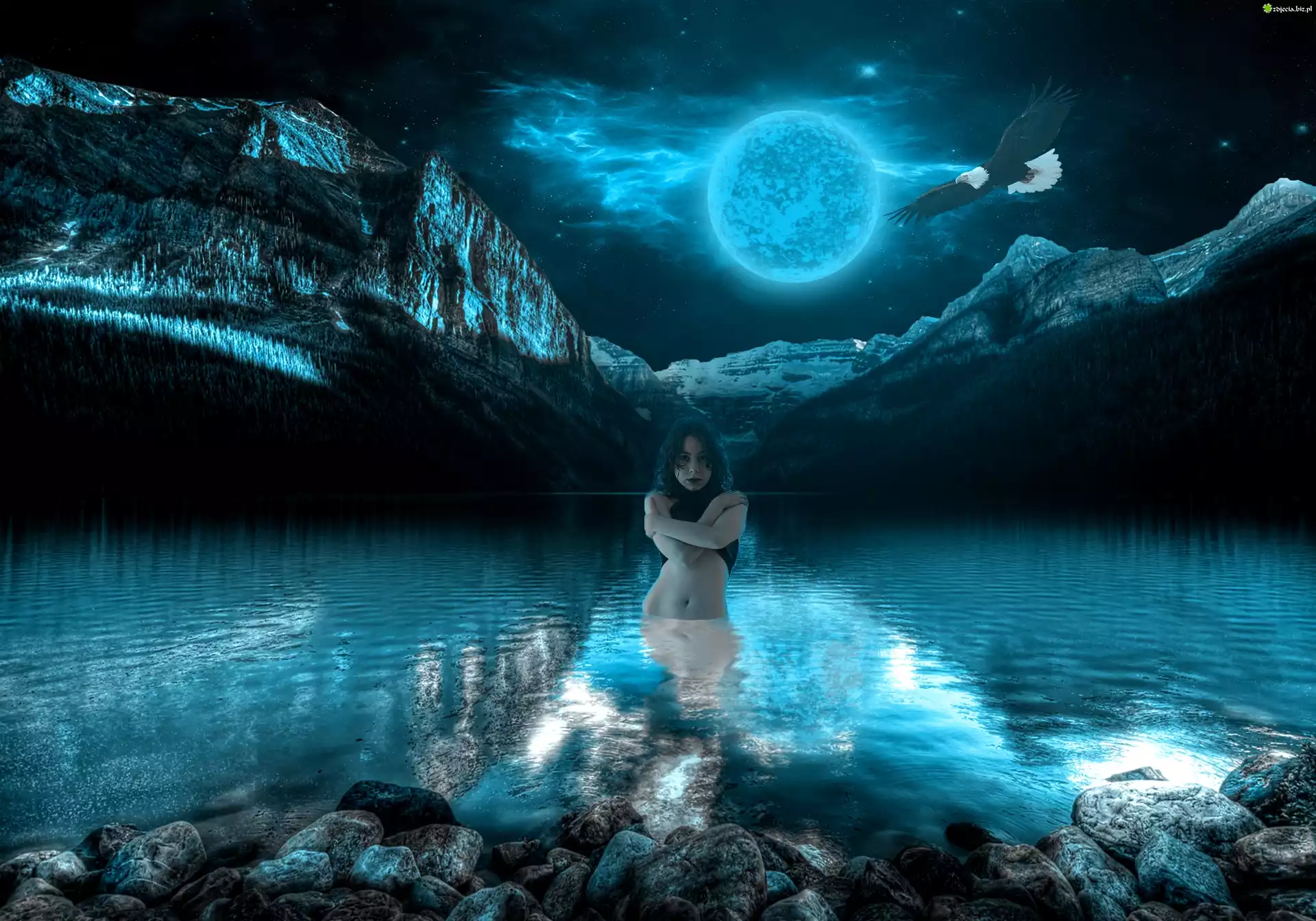 Zdjęcie, Fantasy, Kobieta, Góry, Jezioro, Noc, Księżyc