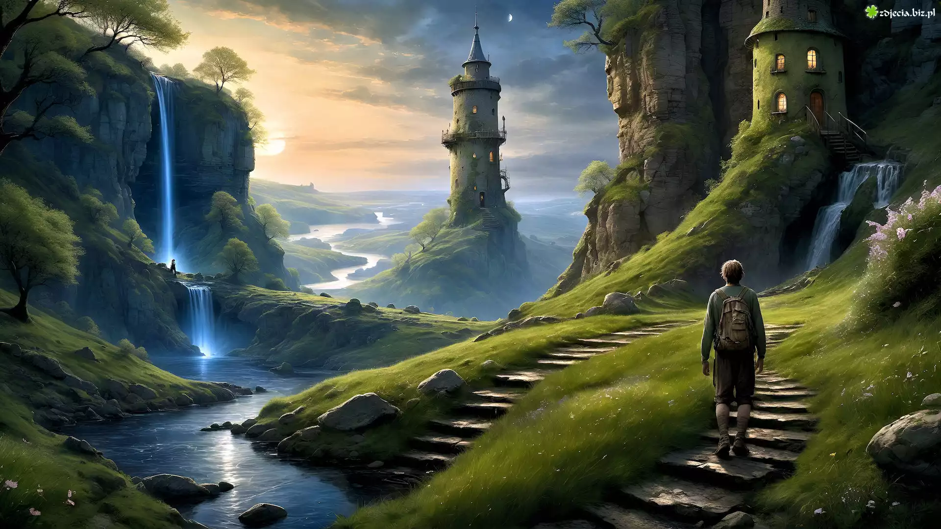 Zdjęcie Grafika, Góry, Rzeka, Wieża, Wodospad, Schody, Wędrowiec, Fantasy
