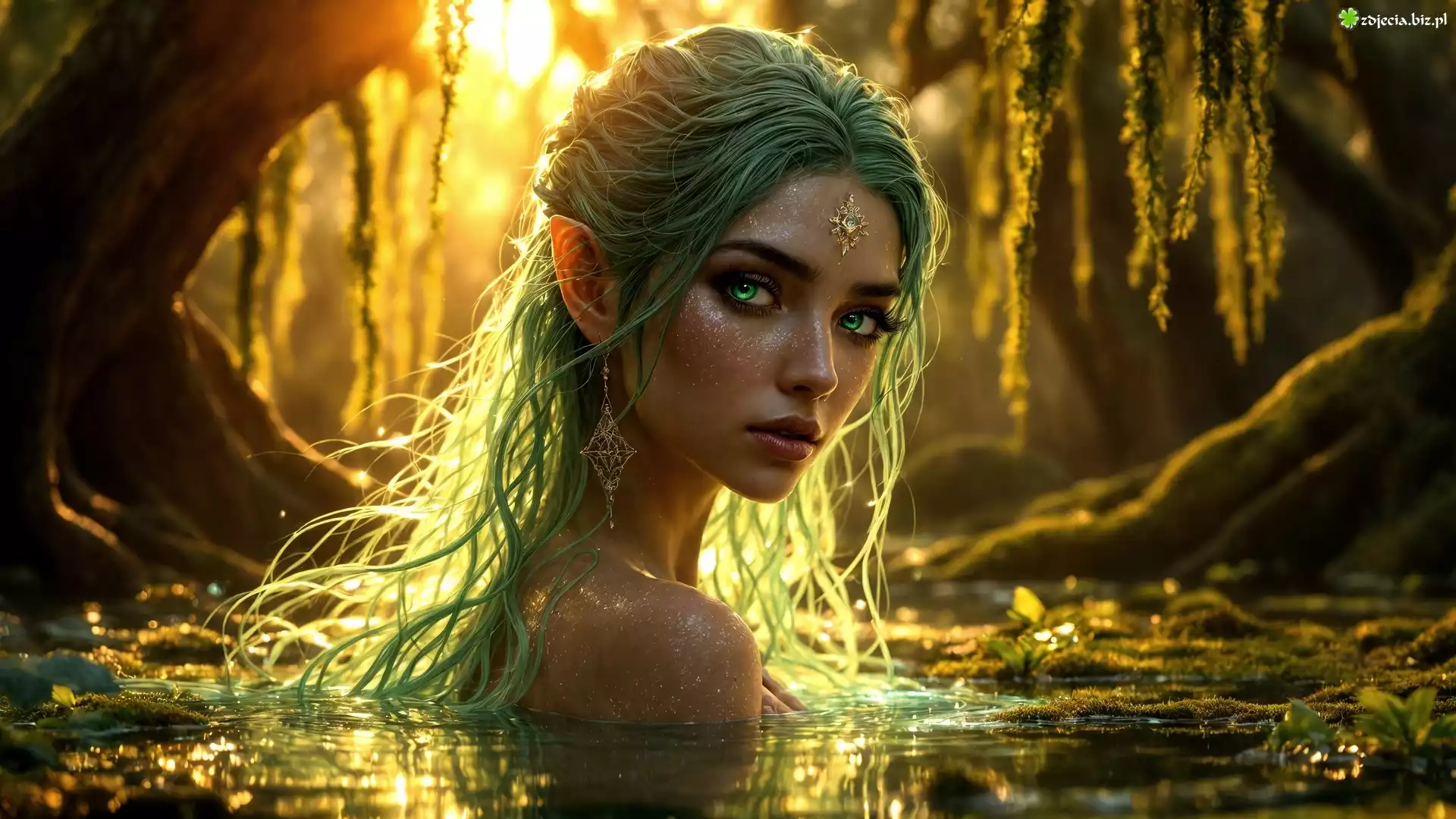 Zdjęcie Dziewczyna, Elfka, Zielone, Włosy, Głowa, Woda, Drzewa, Fantasy