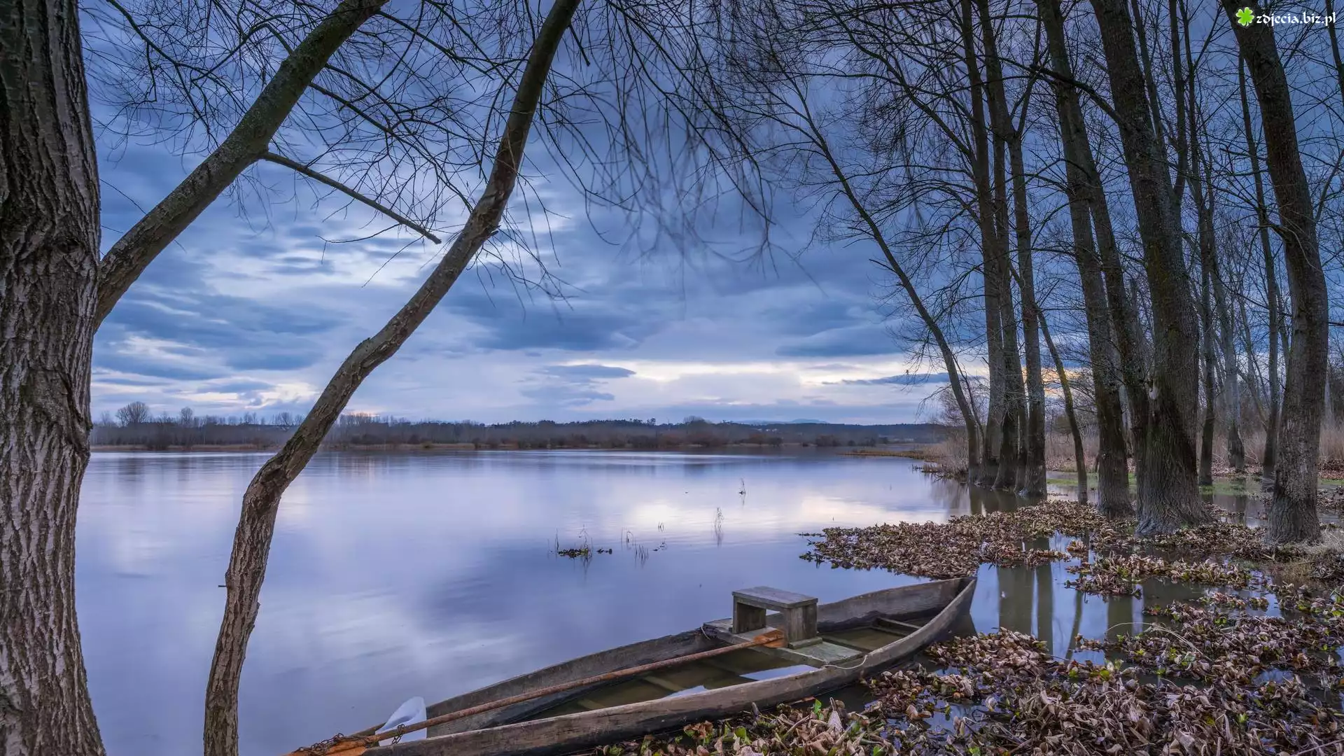 Zdjęcie Jezioro Fermentelos, Jesień, Łódka, Drzewa, Gmina Agueda, Portugalia