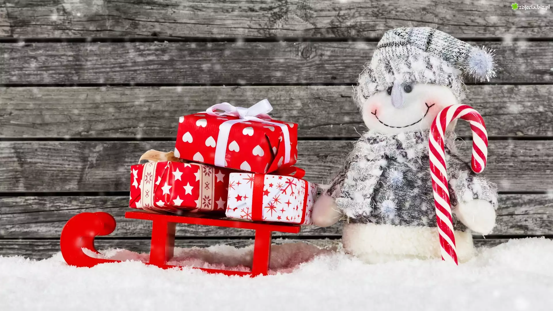 Zdjęcie Dekoracja, Figurka, Bałwanek, Sanki, Prezenty, Śnieg, Świąteczne