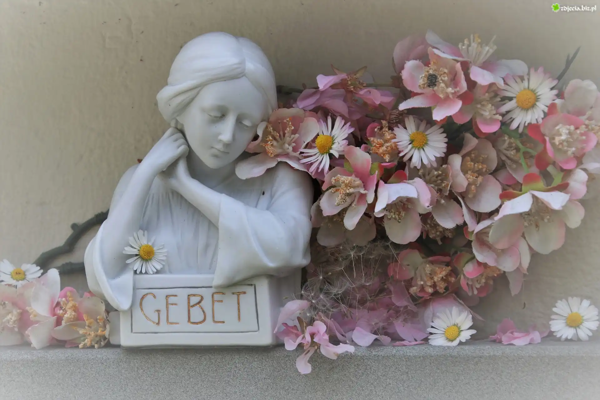 Zdjęcie Figurka, Napis, Gebet, Modlitwa, Kwiaty, Smutek