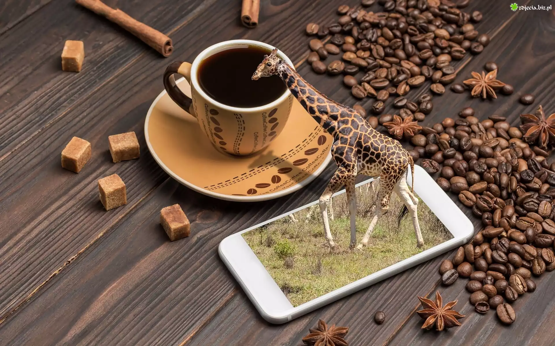 Zdjęcie Kawa, Filiżanka, Ziarna, Cukier, Żyrafa, Telefon, Deska, Fotomontaż