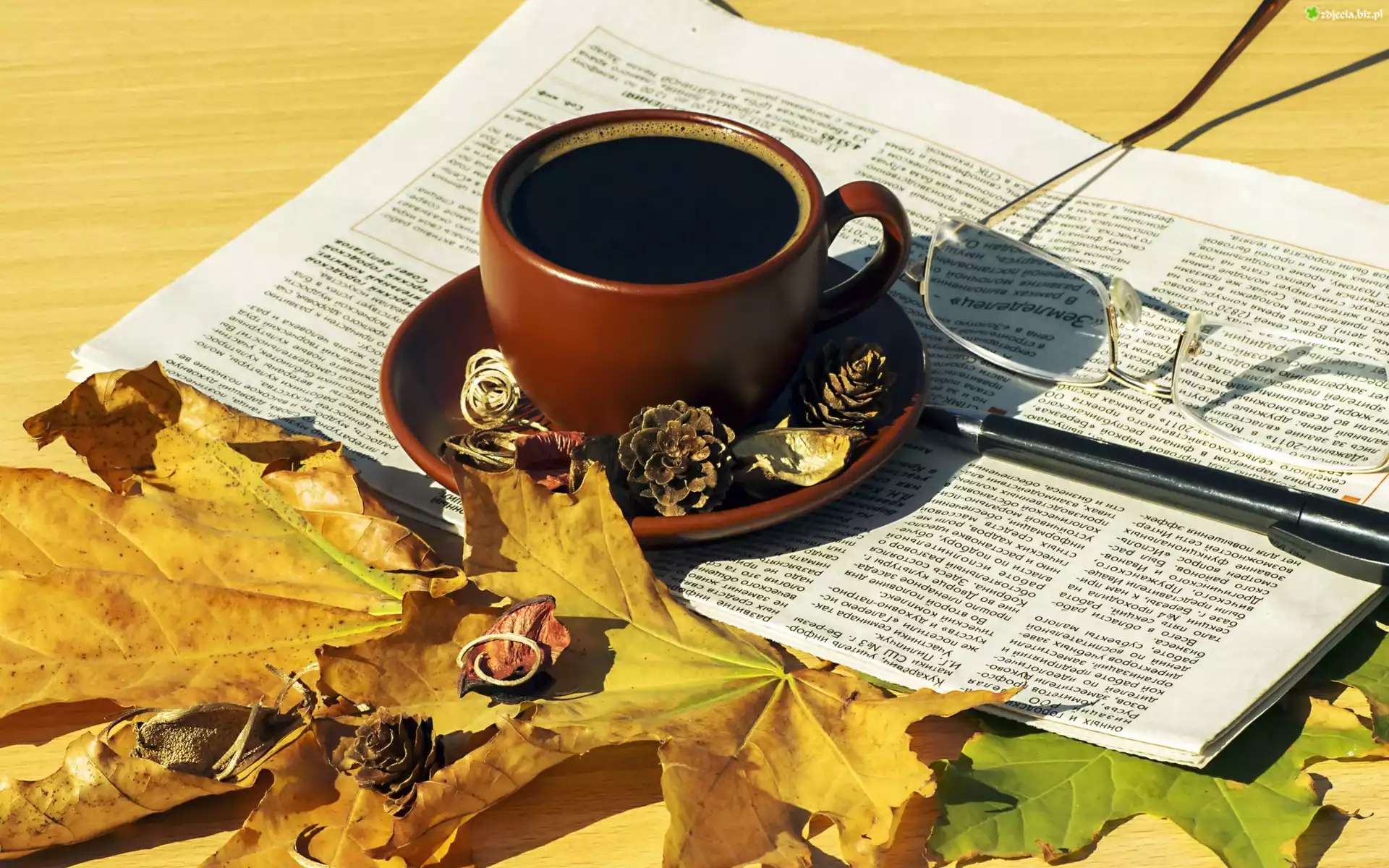 Zdjęcie Filiżanka, Kawy, Jesienne, Liście, Gazeta, Szyszki