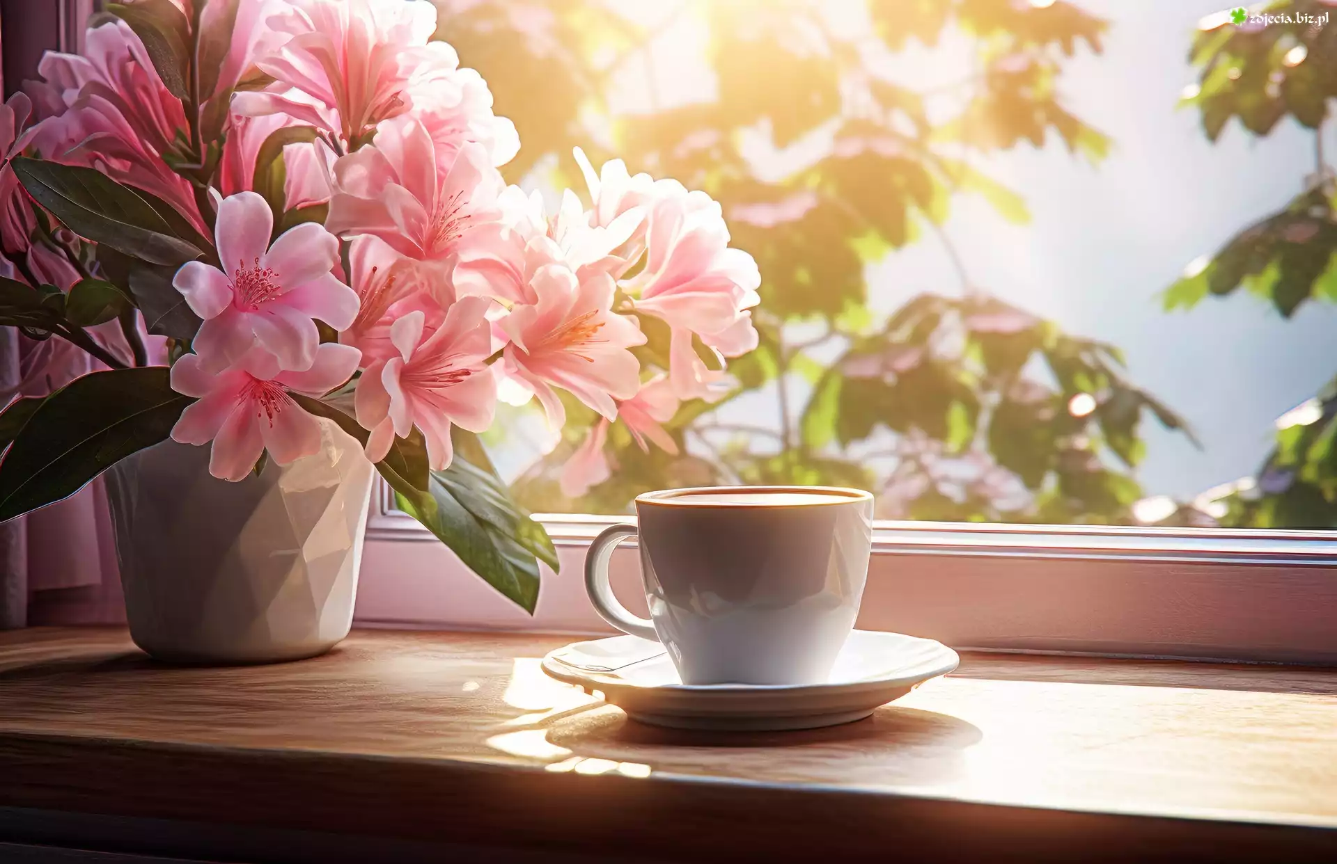 Zdjęcie Azalia, Kwiaty, Bukiet, Filiżanka, Okno, Grafika