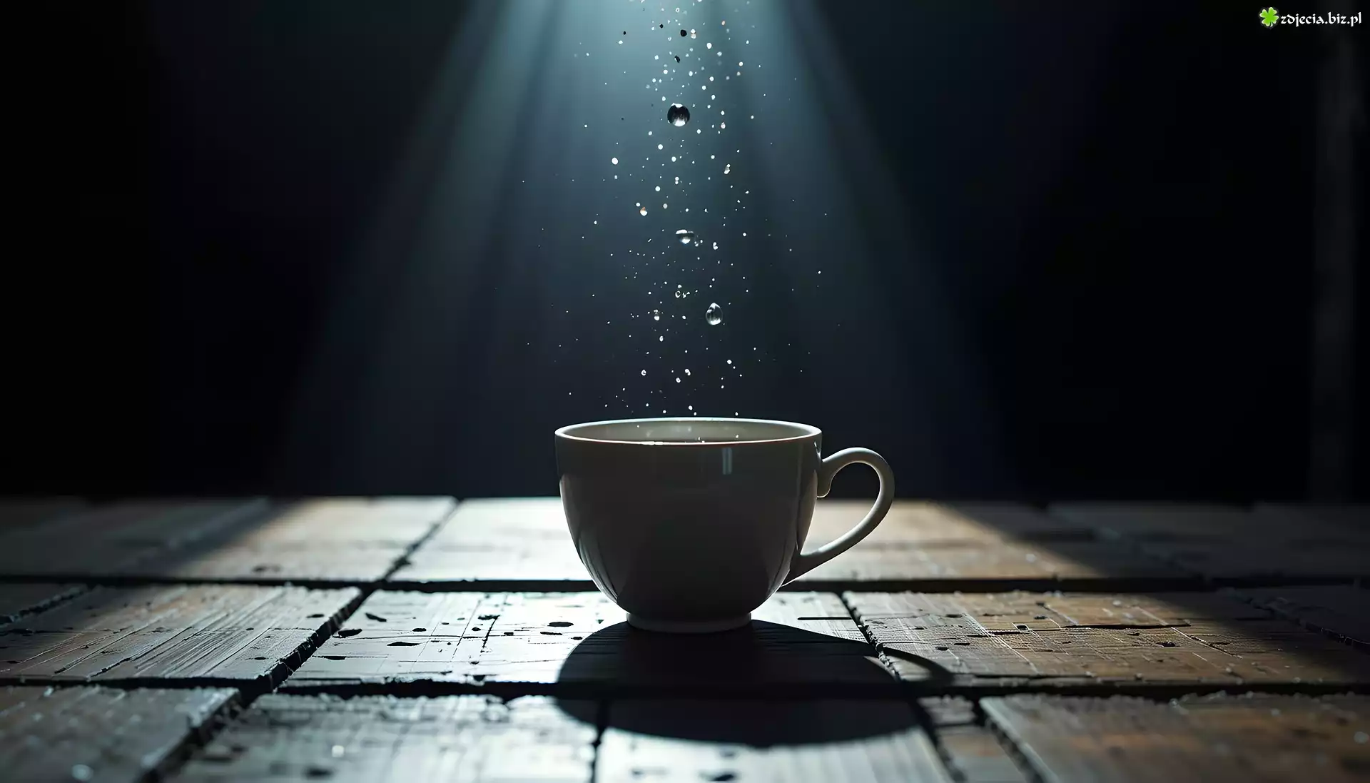 Zdjęcie Filiżanka, Napój, Kawa, Herbata, Stół, Drewniany, Krople, Cień, Grafika, Komputerowa