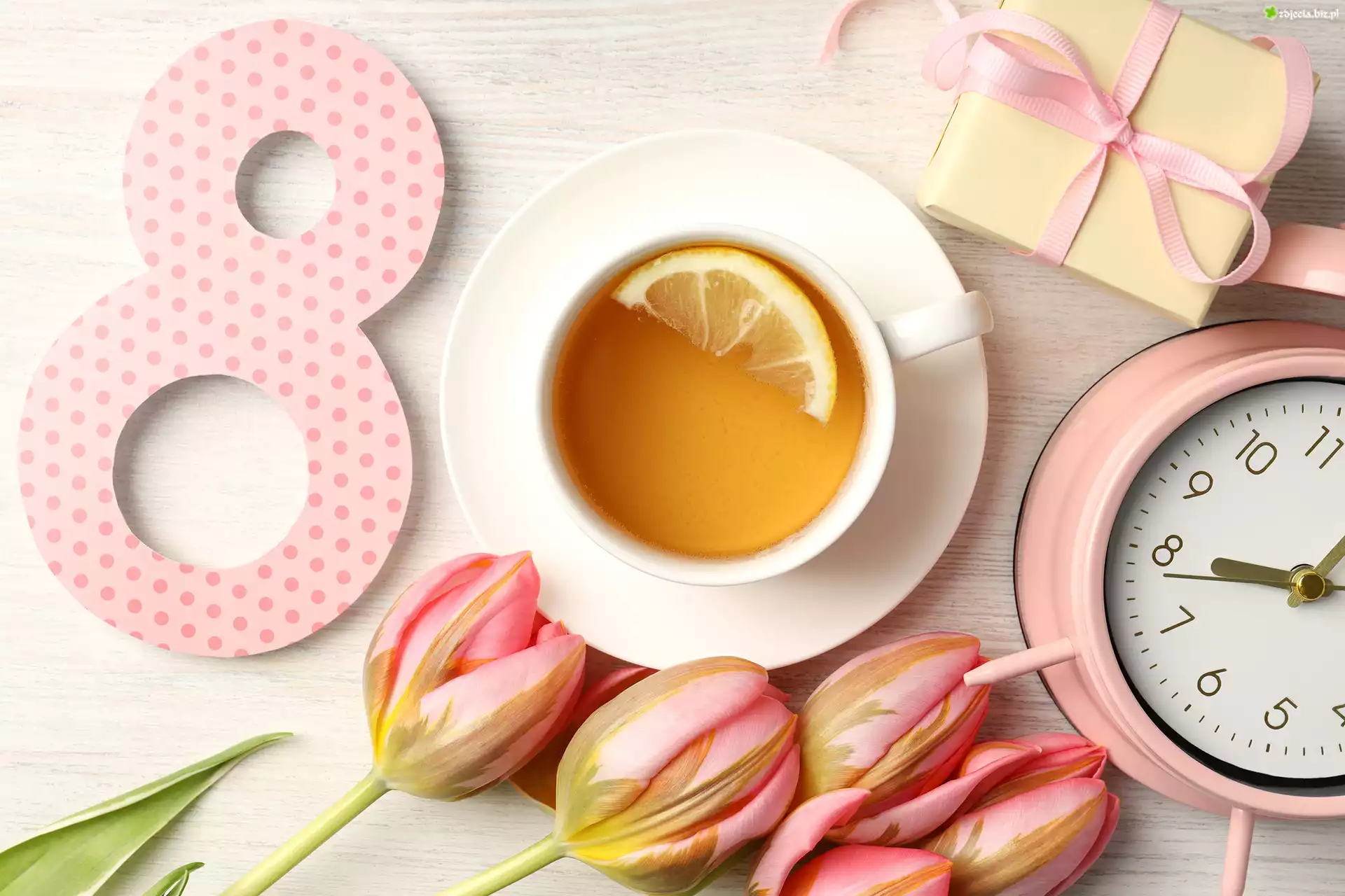 Zdjęcie, Dzień Kobiet, Herbata, Filiżanka, Prezent, Tulipany, Budzik