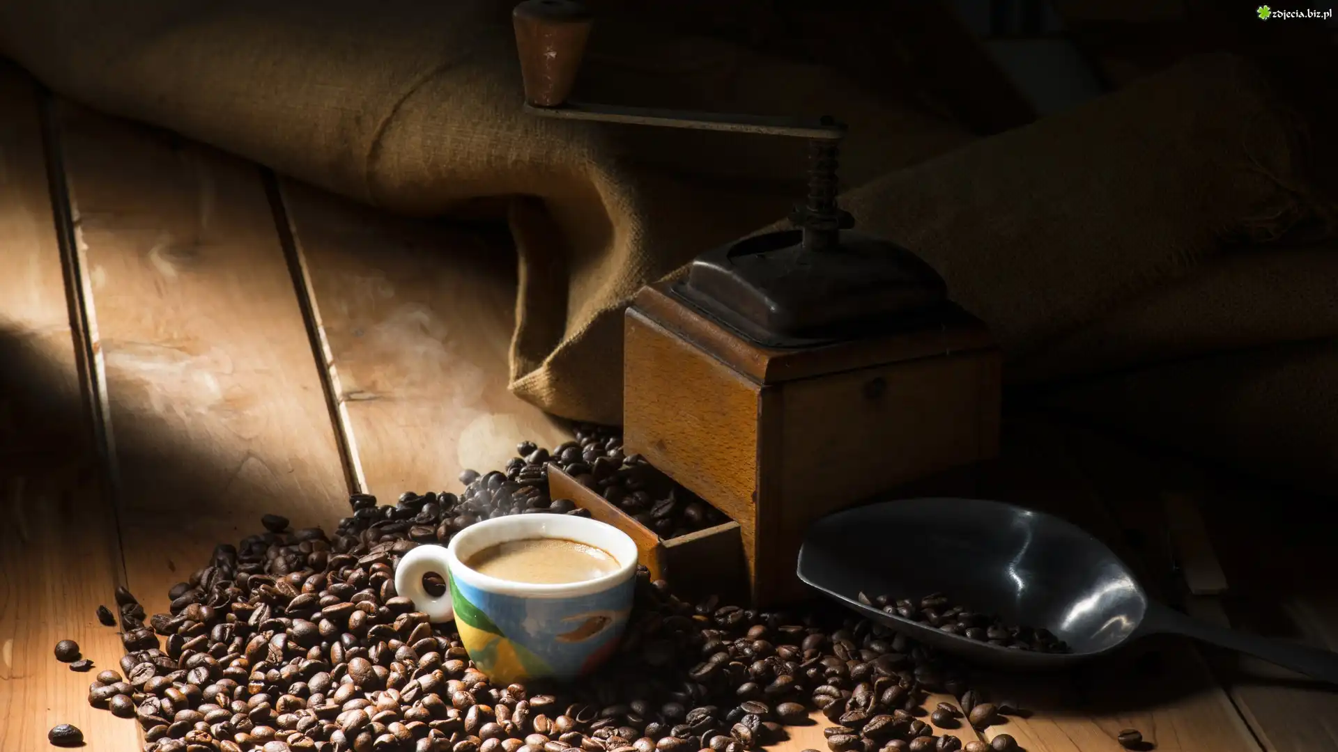 Zdjęcie Kawa, Filiżanka, Młynek, Ziarna, Deski, Worek, Łopatka