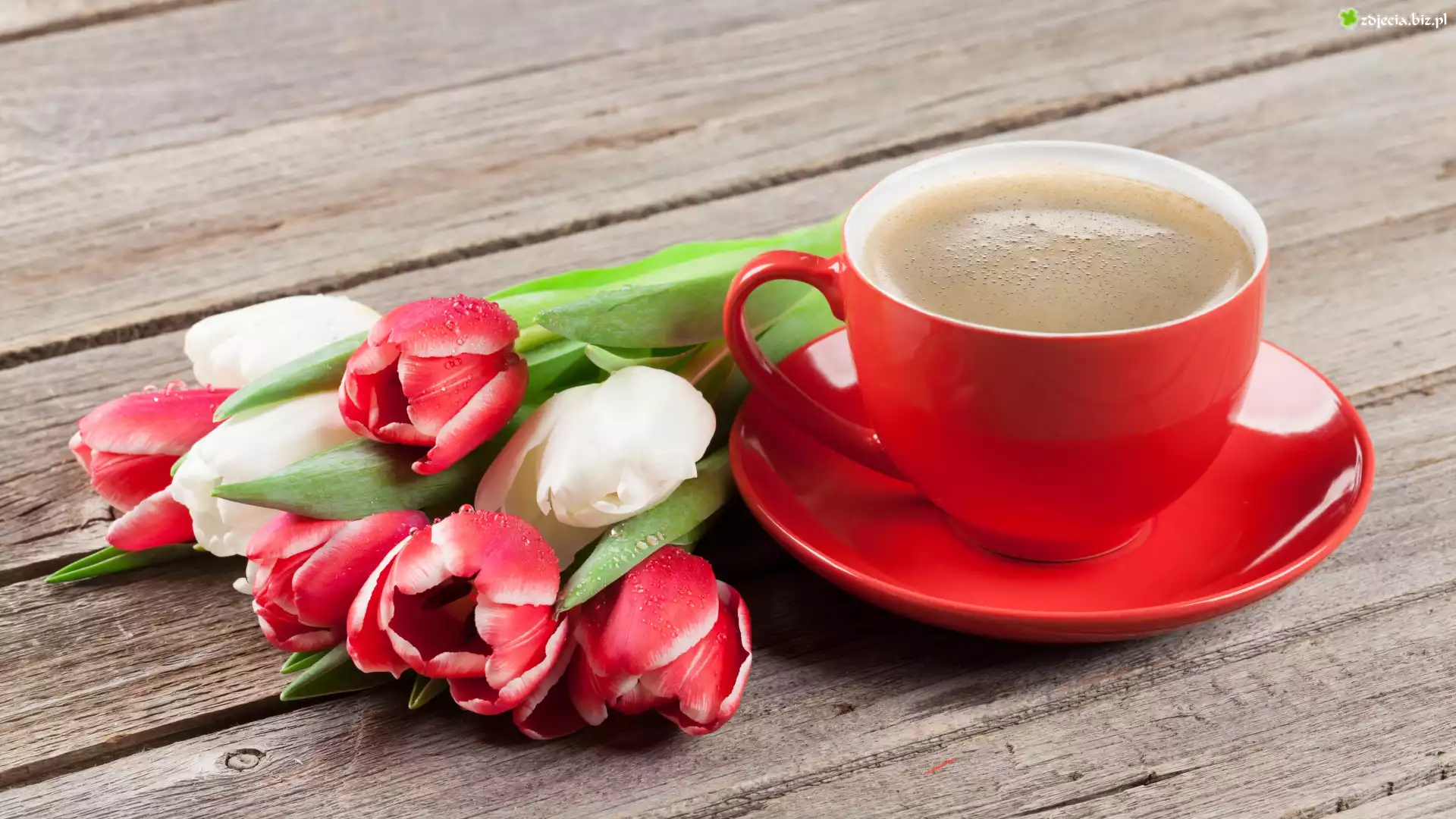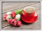 Zdjęcie Czerwona, Filiżanka, Kawa, Kwiaty, Tulipany