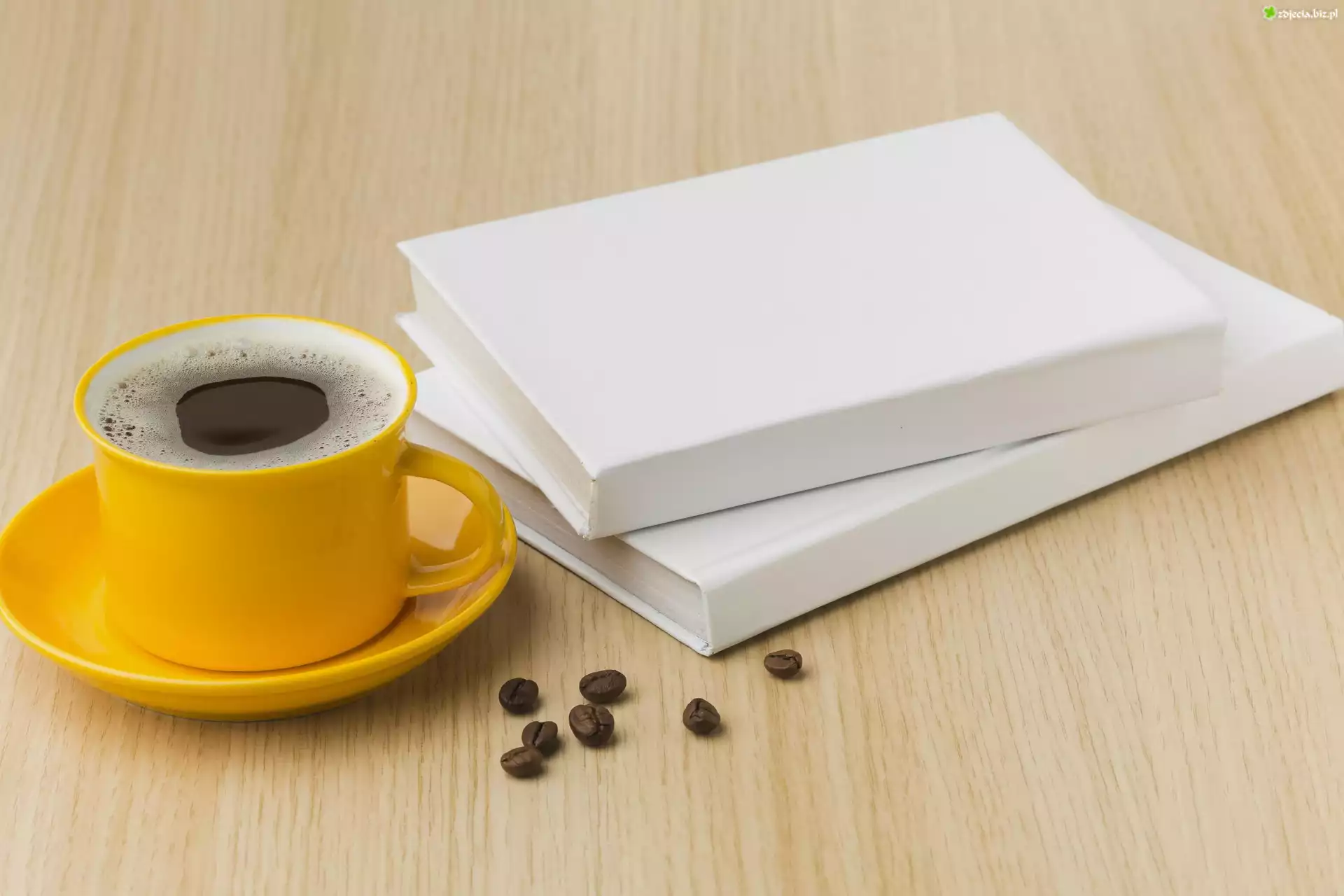 Zdjęcie, Stół, Filiżanka, Kawa, Spodek, Ziarenka kawy, Książki