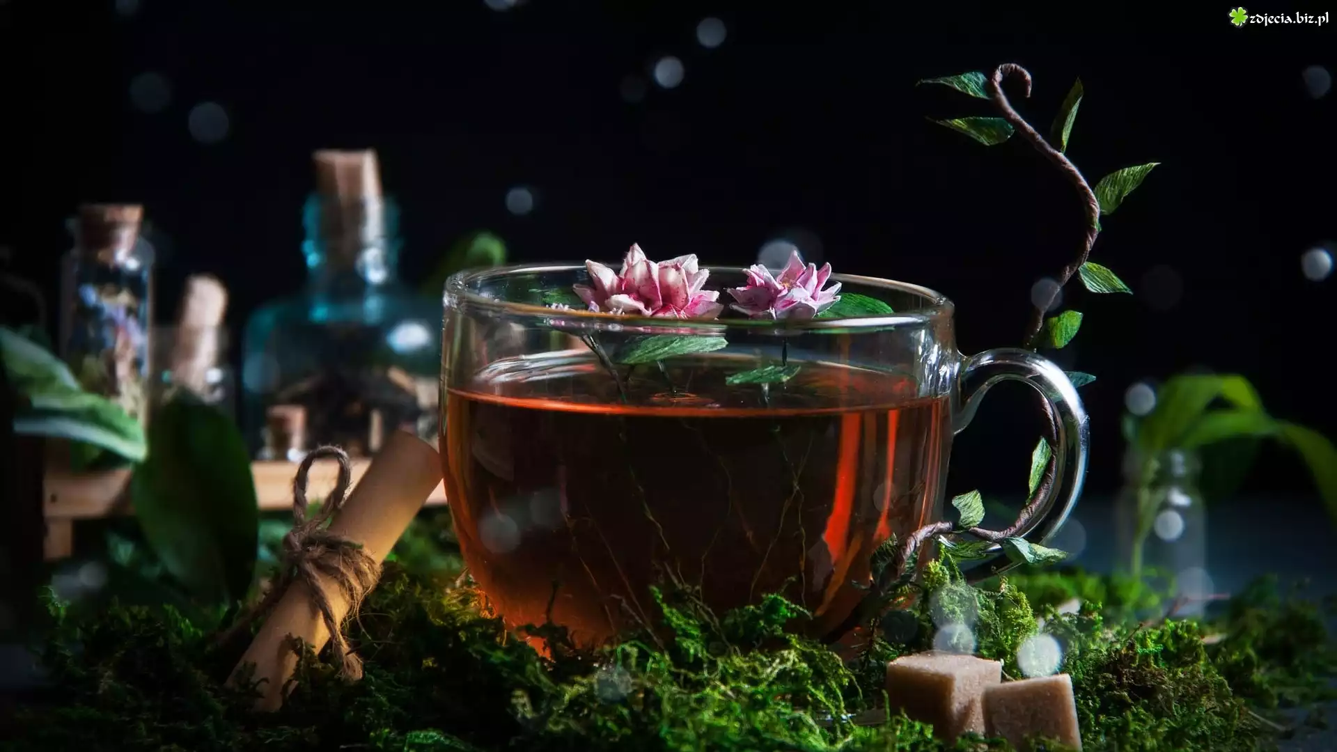 Zdjęcie Szklana, Filiżanka, Herbata, Kwiaty, Mech, Słoik, Cukier