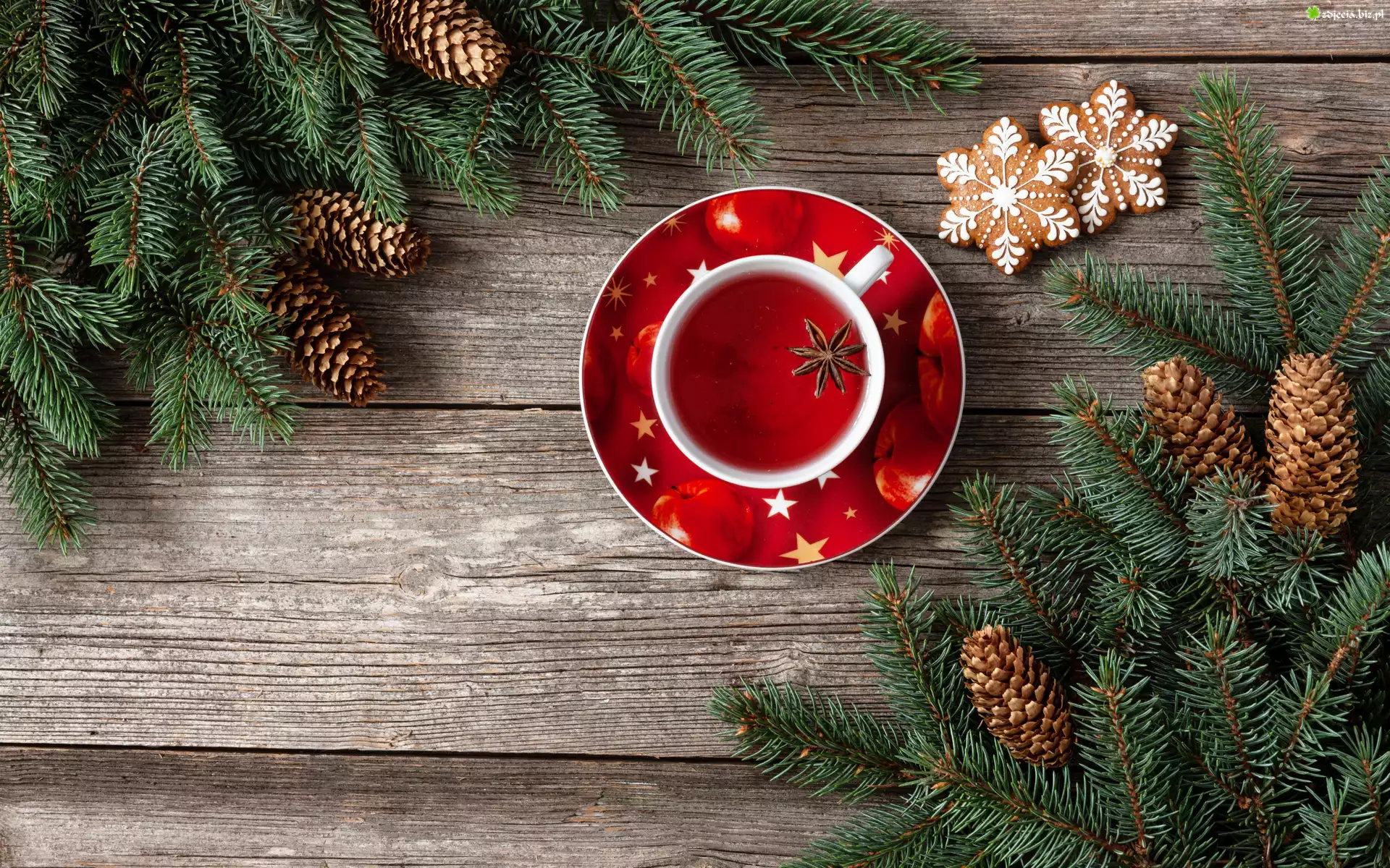 Zdjęcie Filiżanka, Herbata, Pierniczki, Gałązki, Świerku, Szyszki