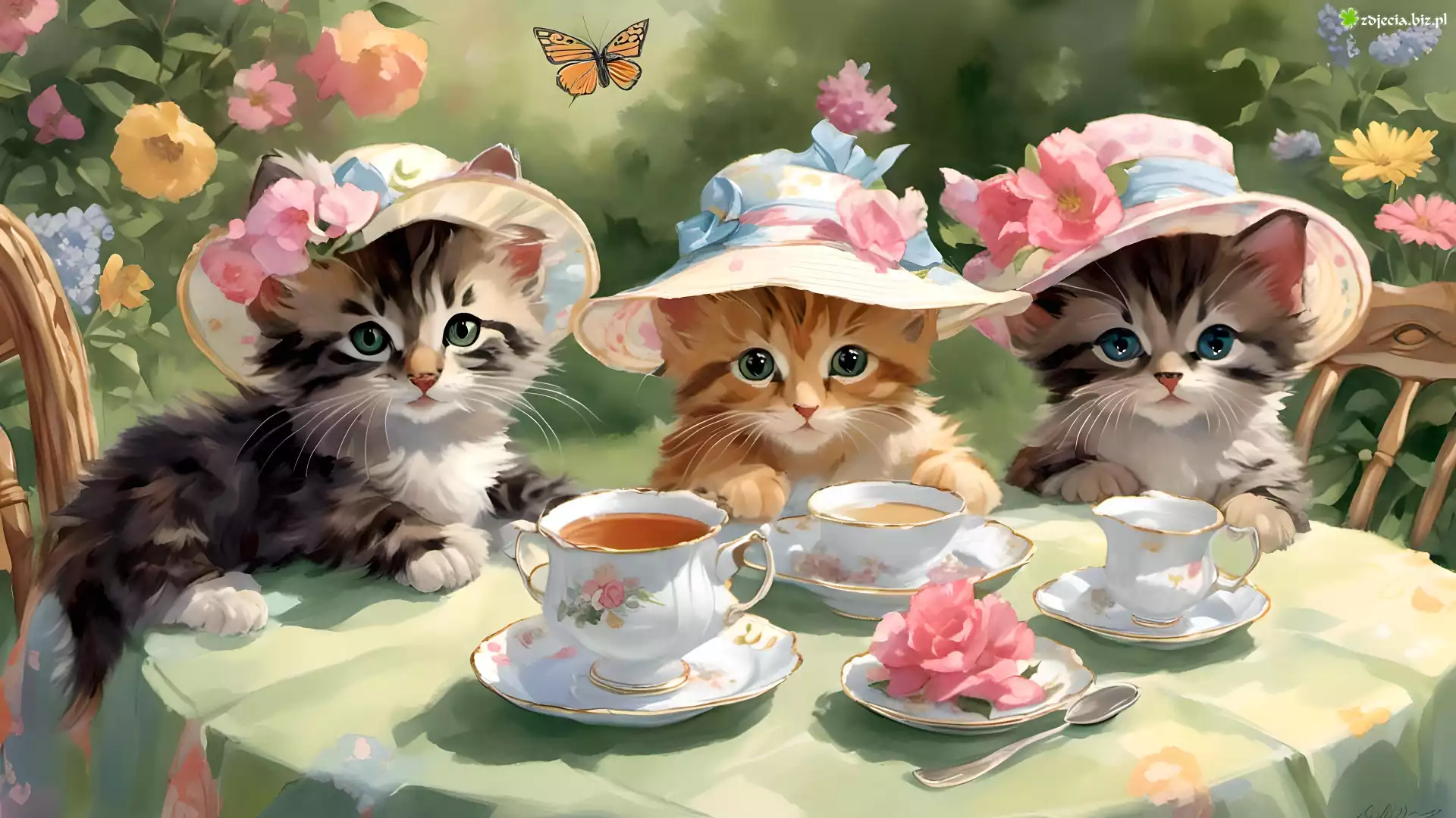Zdjęcie Kotki, Kapelusze, Stół, Filiżanki, Kwiaty, Motyl, Grafika