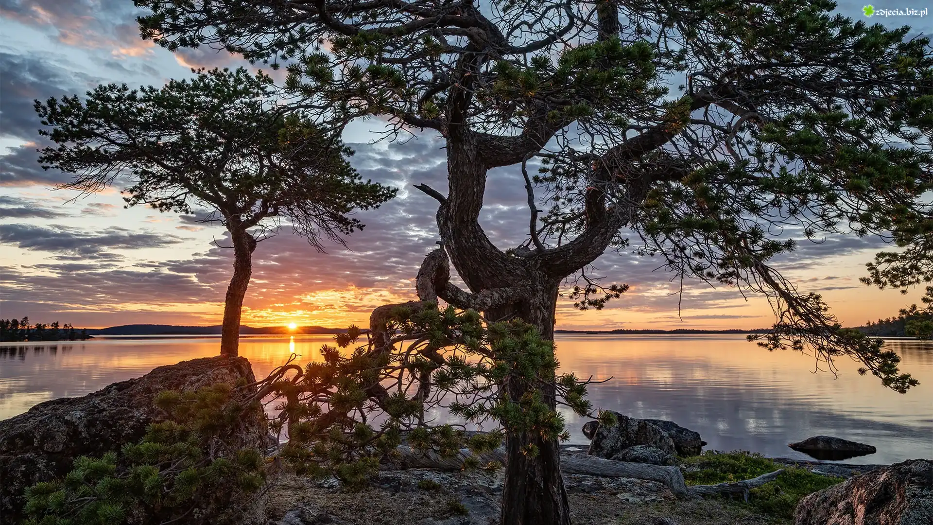 Zdjęcie Jezioro, Lake Inari, Drzewa, Zachód słońca, Chmury, Laponia, Finlandia