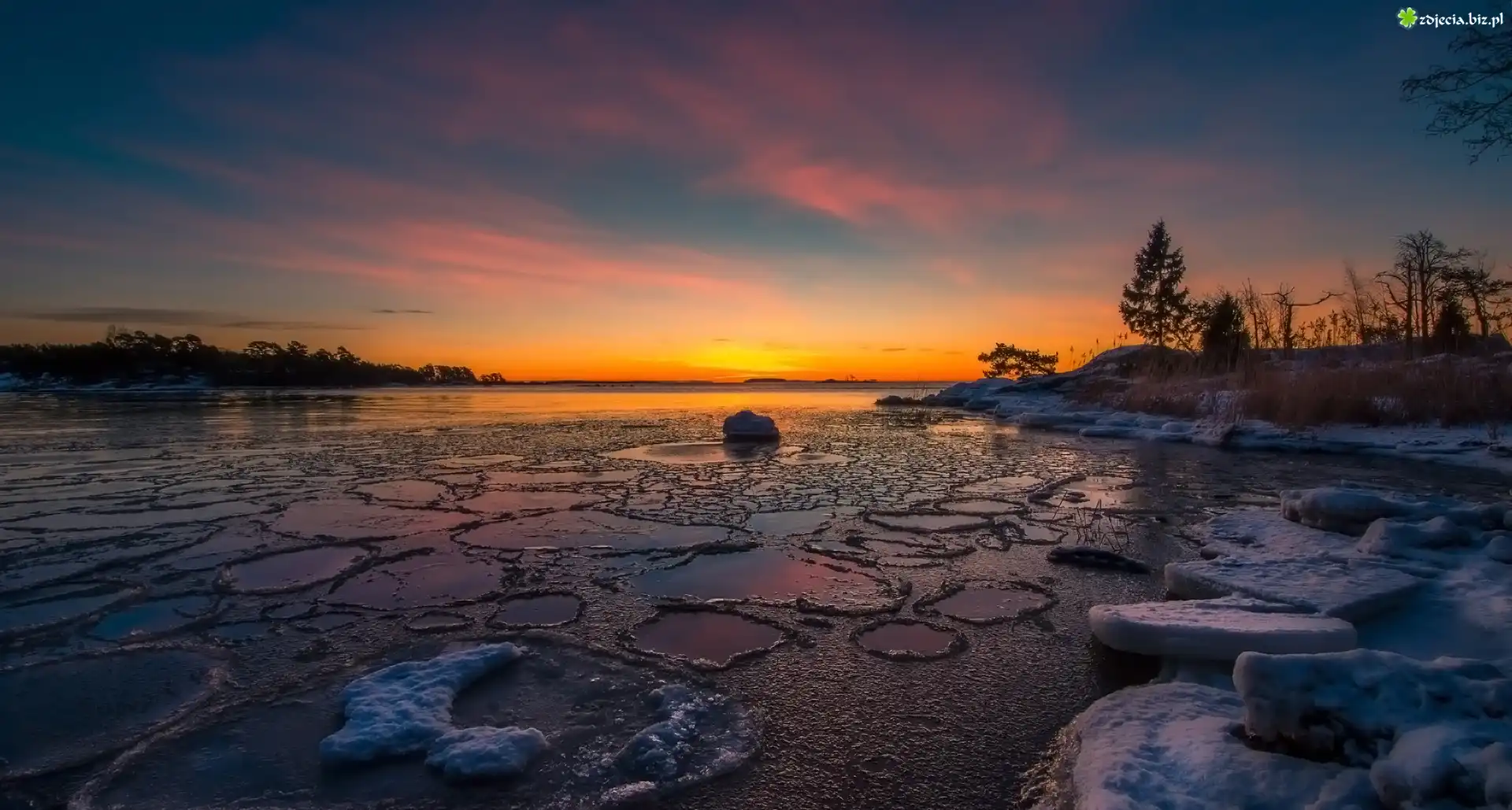 Zdjęcie Przylądek Kallahti, Finlandia, Zima, Zatoka, Morze Bałtyckie, Lód, Drzewa, Wschód słońca