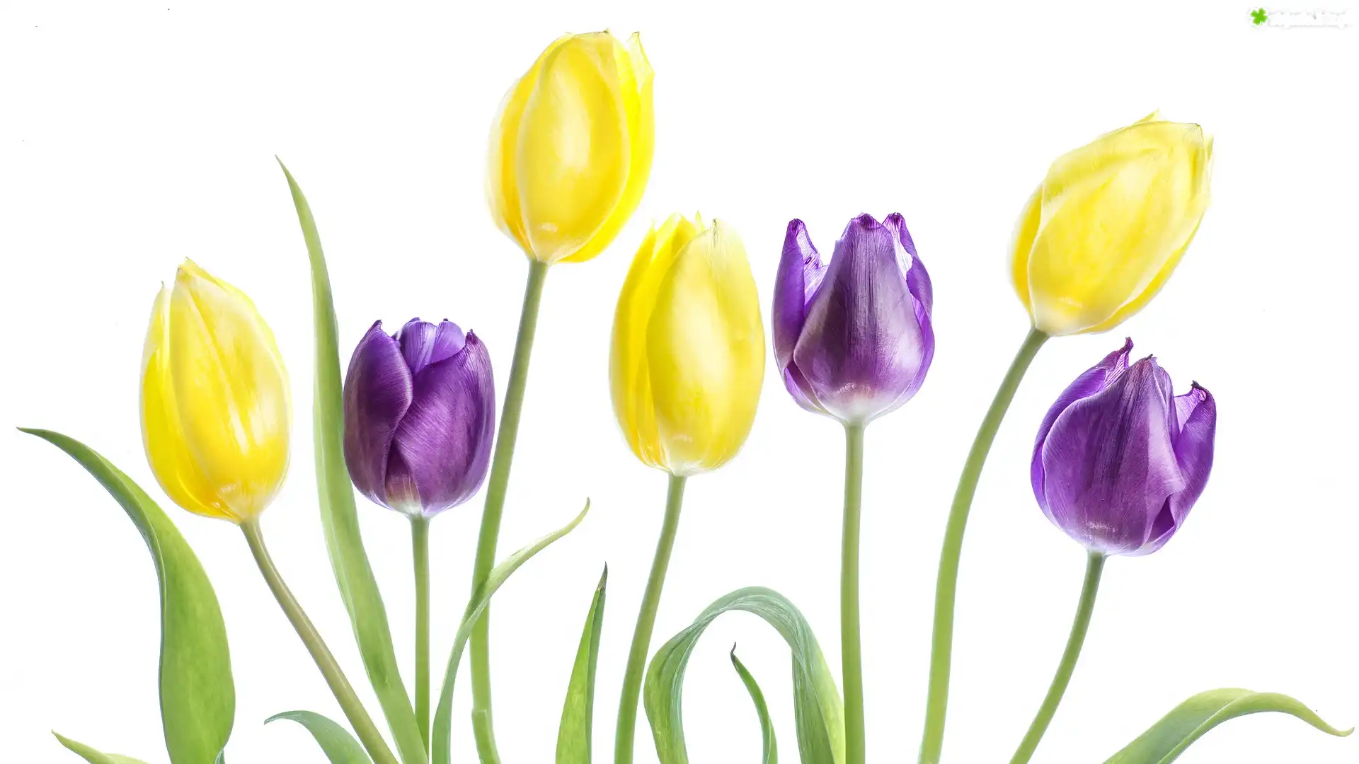 Zdjęcie Fioletowe, Żółte, Tulipany, Białe tło
