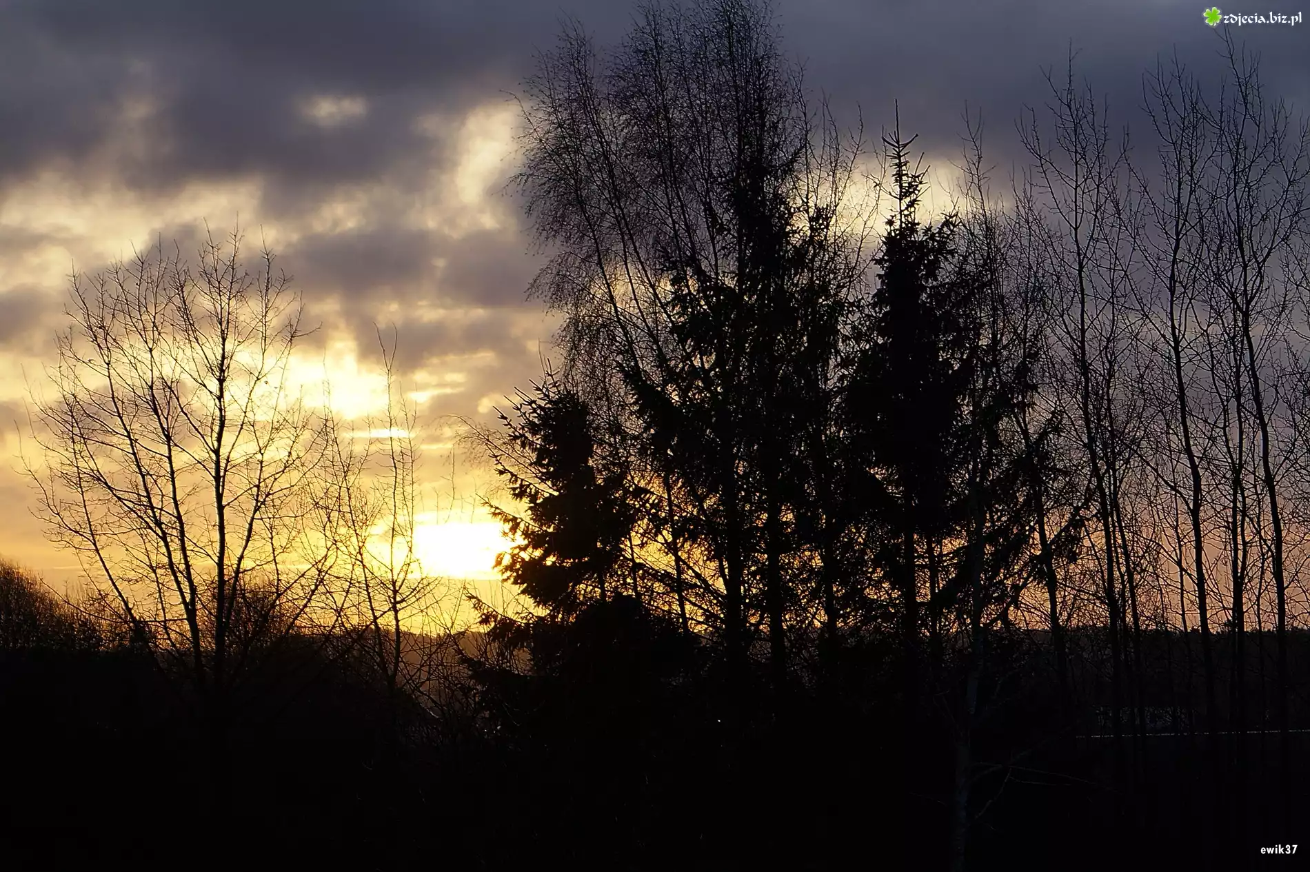 Zdjęcie Fioletowe,Niebo, Słońce, Choinki, Brzozy