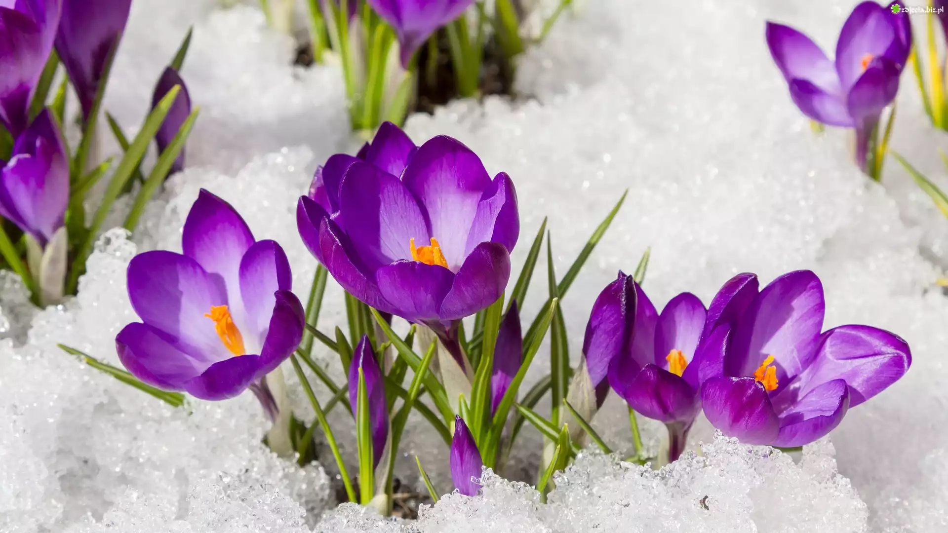 Zdjęcie Fioletowe, Krokusy, Kępki, Śnieg