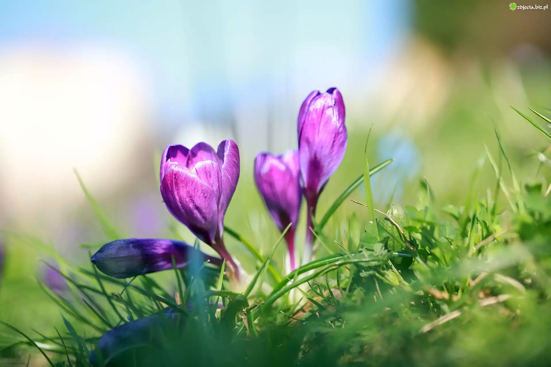Zdjęcie Rozświetlone, Fioletowe, Kwiaty, Krokusy, Trawa