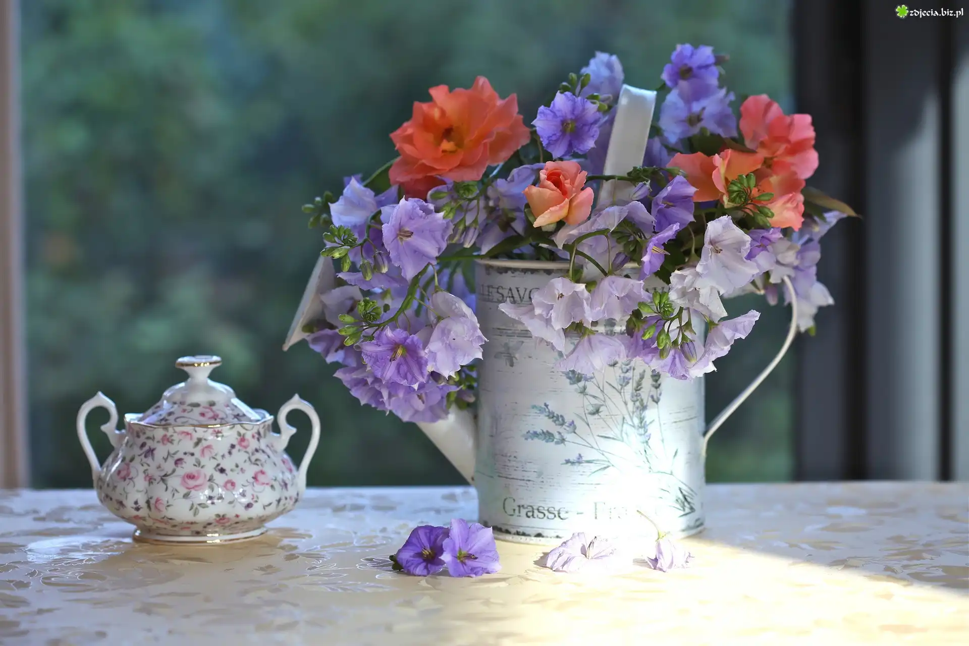 Zdjęcie Fioletowe, Czerwone, Kwiaty, Konewka, Porcelana, Stół