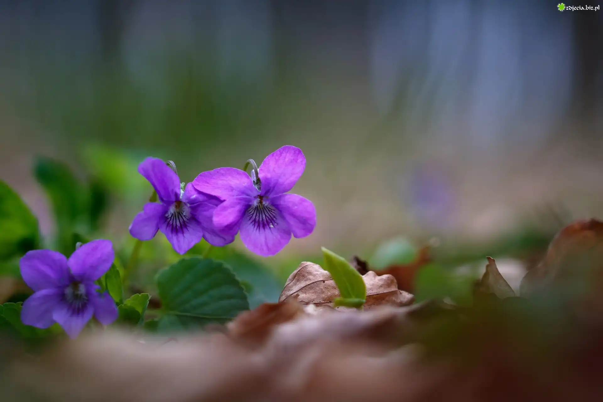 Zdjęcie, Fiołki, Kwiaty, Liście, Ściółka