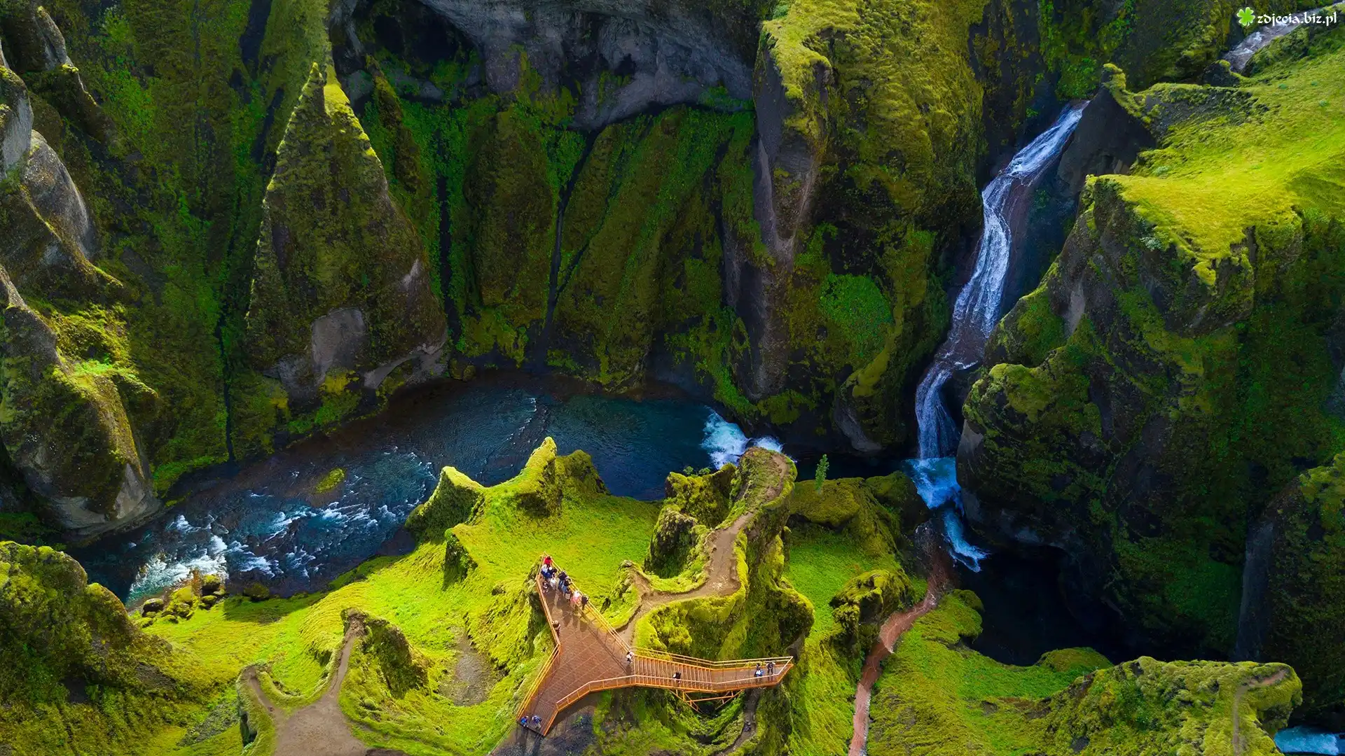 Zdjęcie Rzeka Fjadra, Góry, Ludzie, Wodospad, Kanion Fjaorargljufu, Islandia
