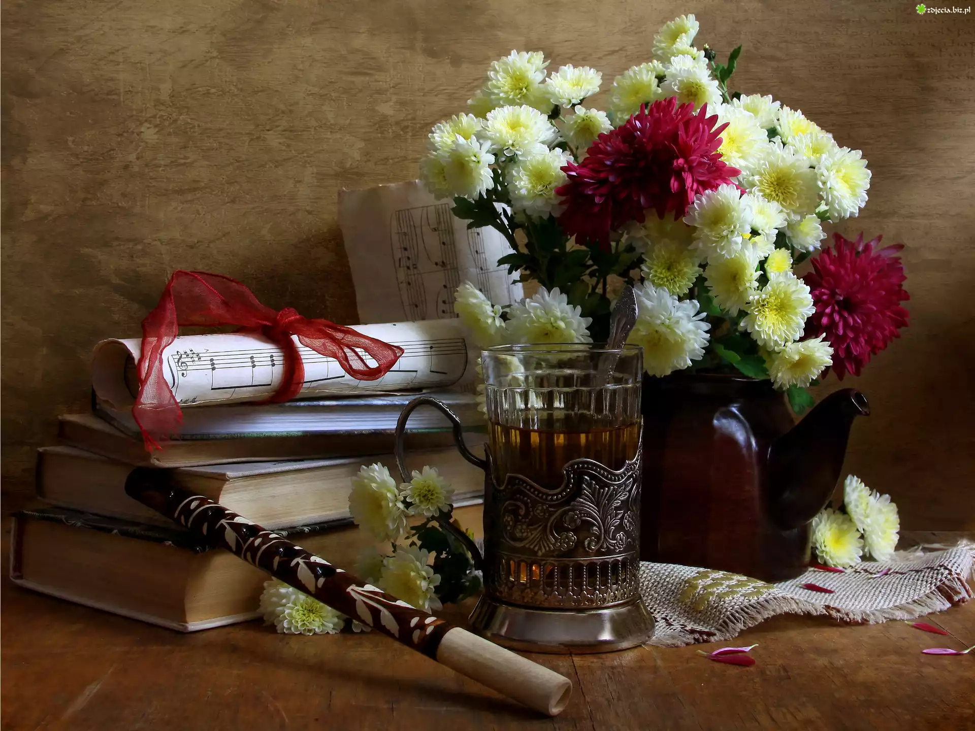 Zdjęcie Flakon, Chryzantemy, Książki, Herbatka, Fujarka, Nuty