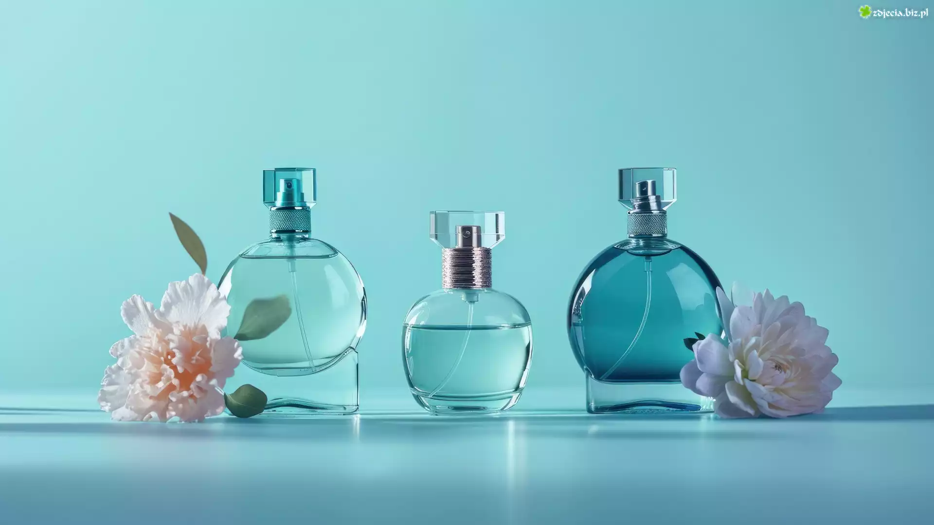 Zdjęcie, Perfumy, Flakon, Kwiaty, Niebieskie, Tło