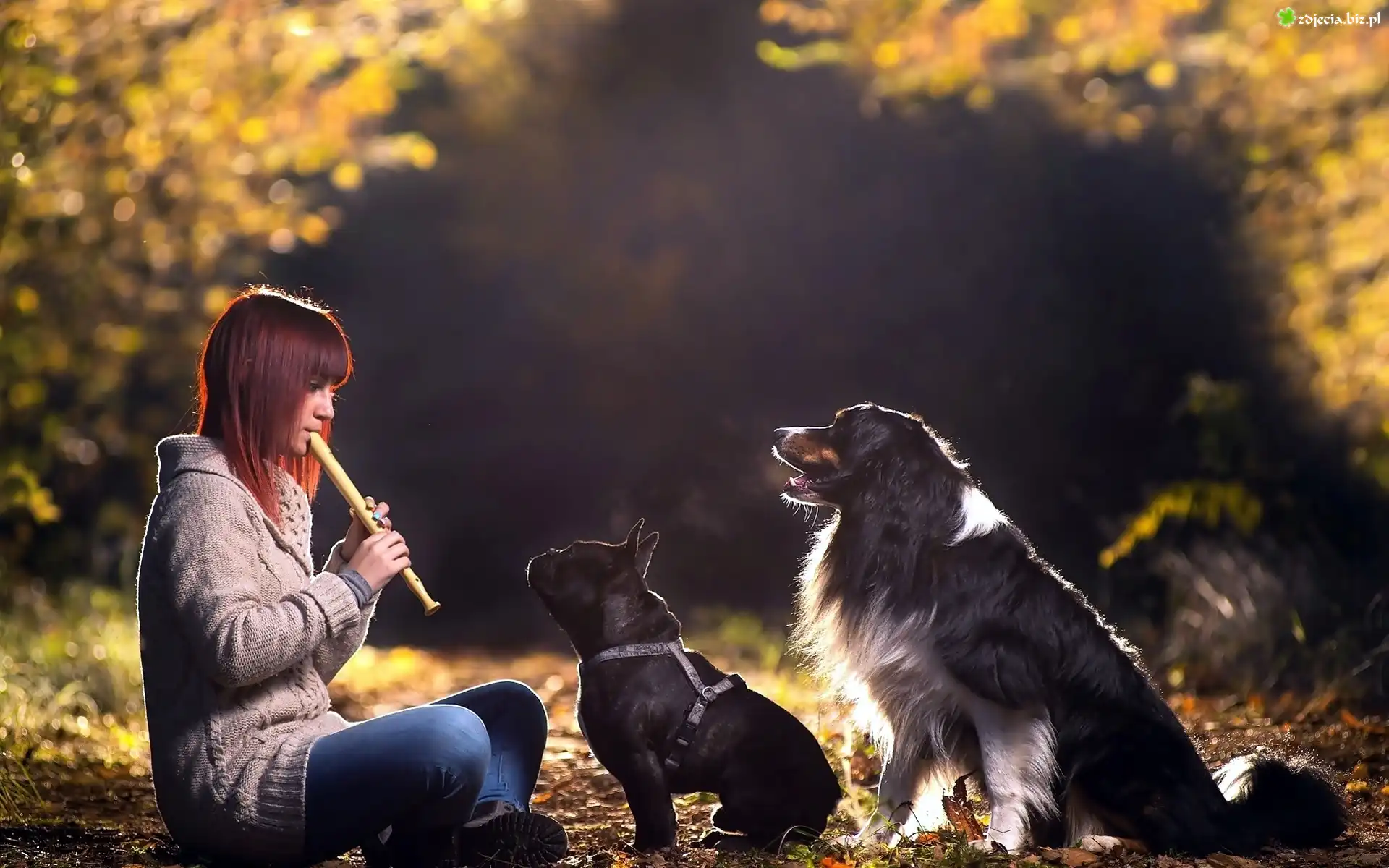 Zdjęcie Dziewczyna, Flet, Zasłuchane, Psy, Droga, Las, Jesień