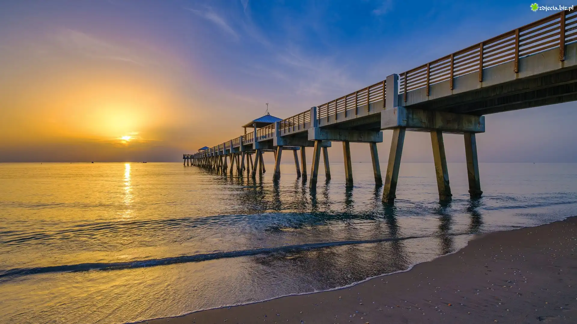 Zdjęcie Morze, Molo, Juno Beach Pier, Wschód słońca, Juno Beach, Floryda, Stany Zjednoczone