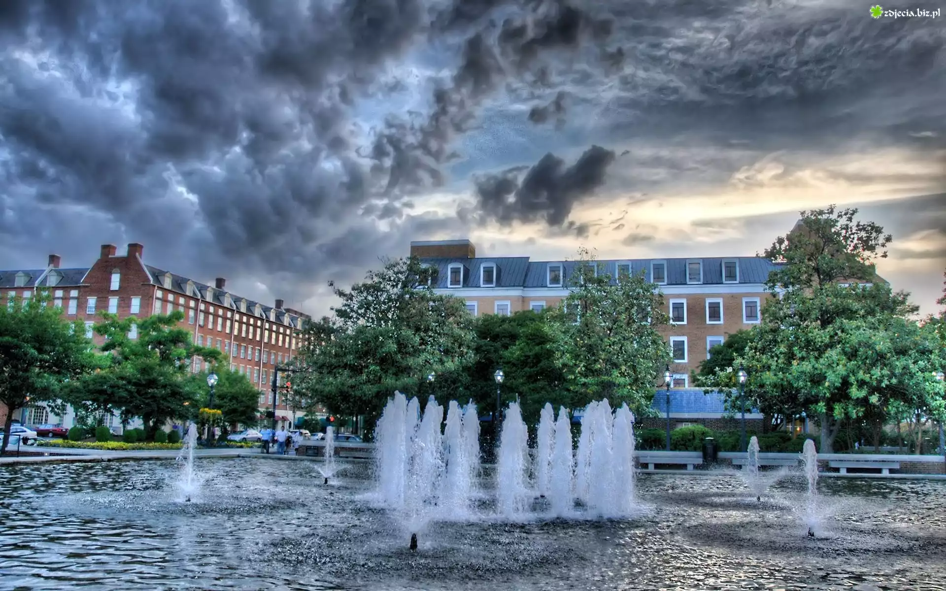 Zdjęcie Fontanna, Budynki, Drzewa, Niebo