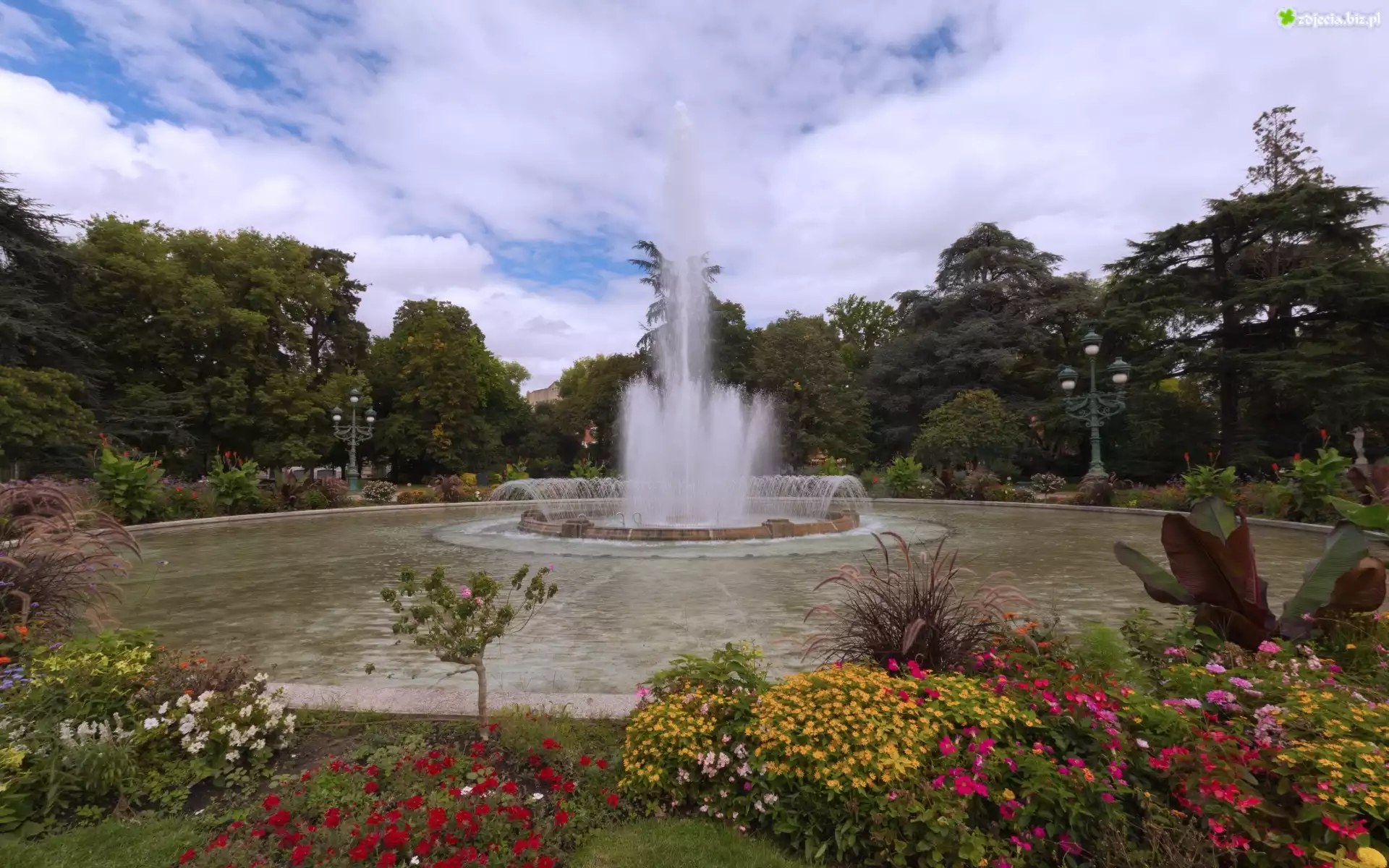 Zdjęcie Fontanna, Kwiaty, Latarnie, Staw, Park