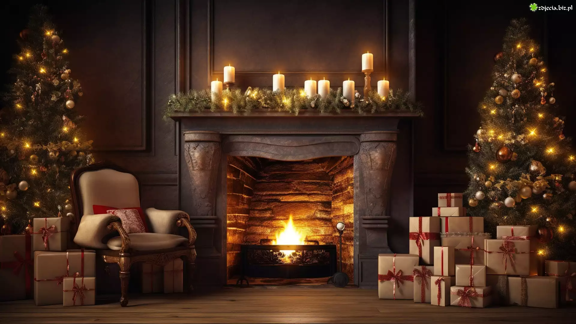Zdjęcie Boże Narodzenie, Pokój, Choinki, Kominek, Prezenty, Świeczki, Fotel