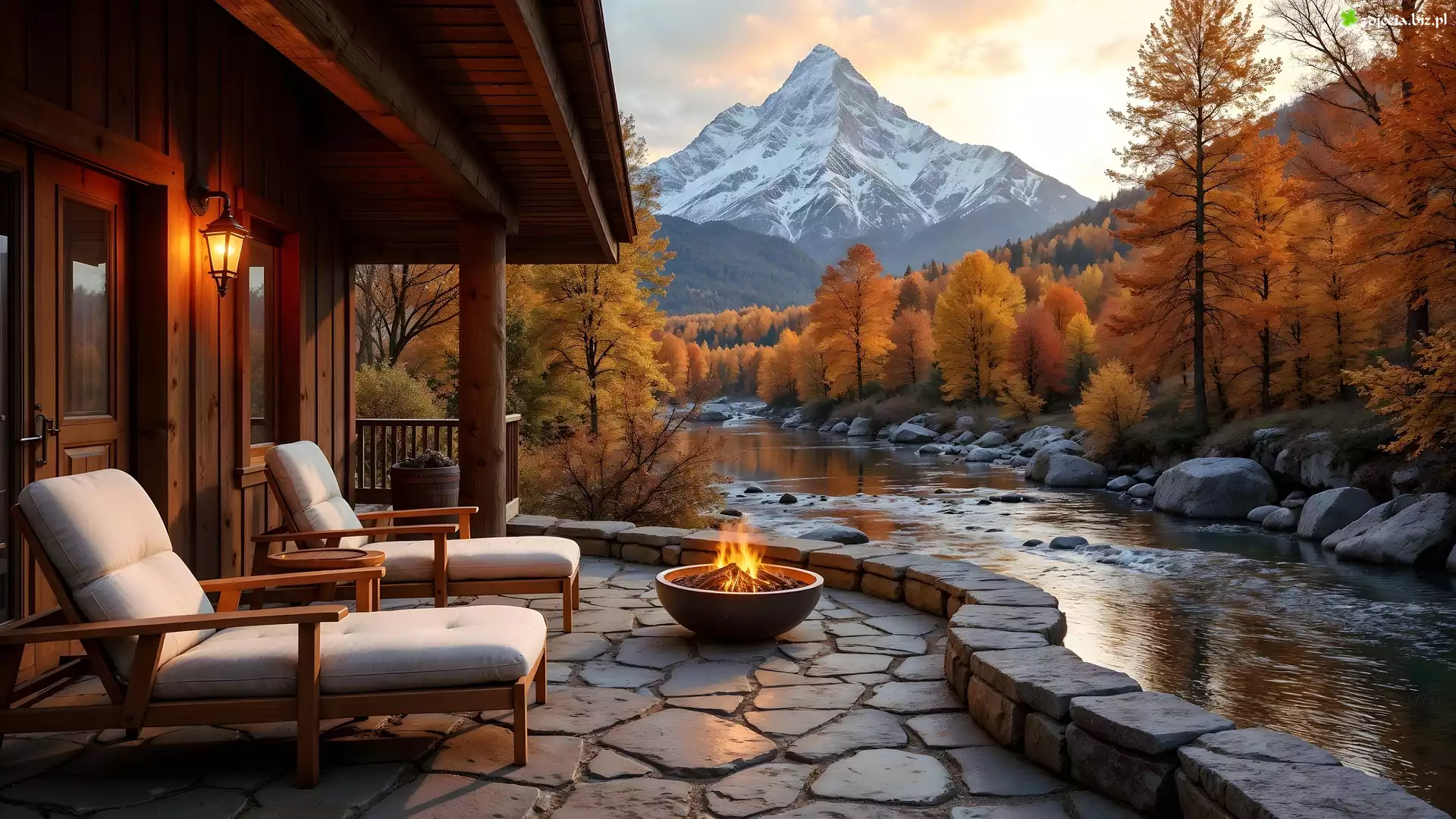 Zdjęcie Jesień, Góry, Drzewa, Rzeka, Dom, Taras, Ogień, Fotele