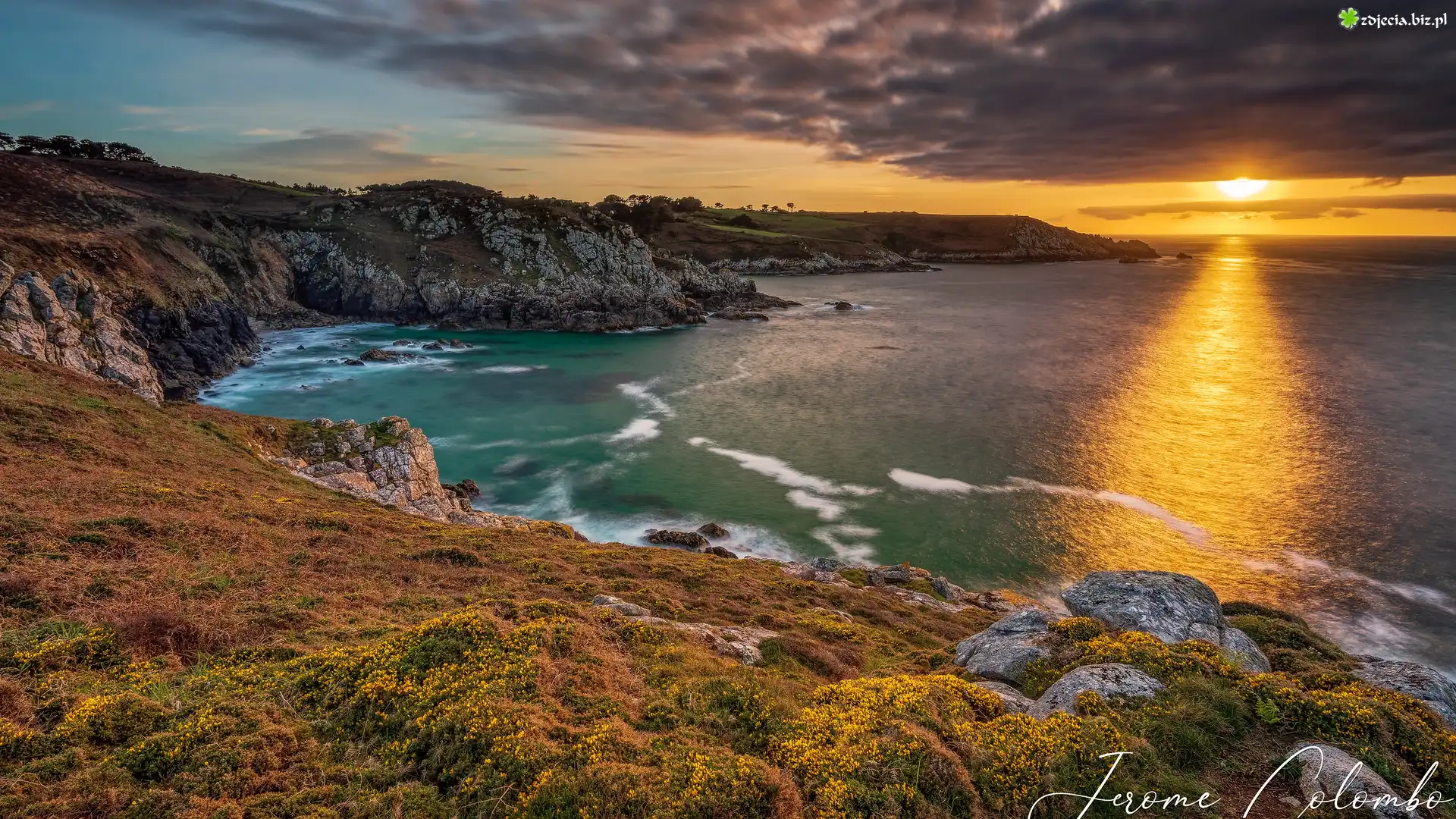 Zdjęcie Zachód słońca, Skały, Wybrzeże, Morze, Beuzec Cap Sizun, Bretania, Francja