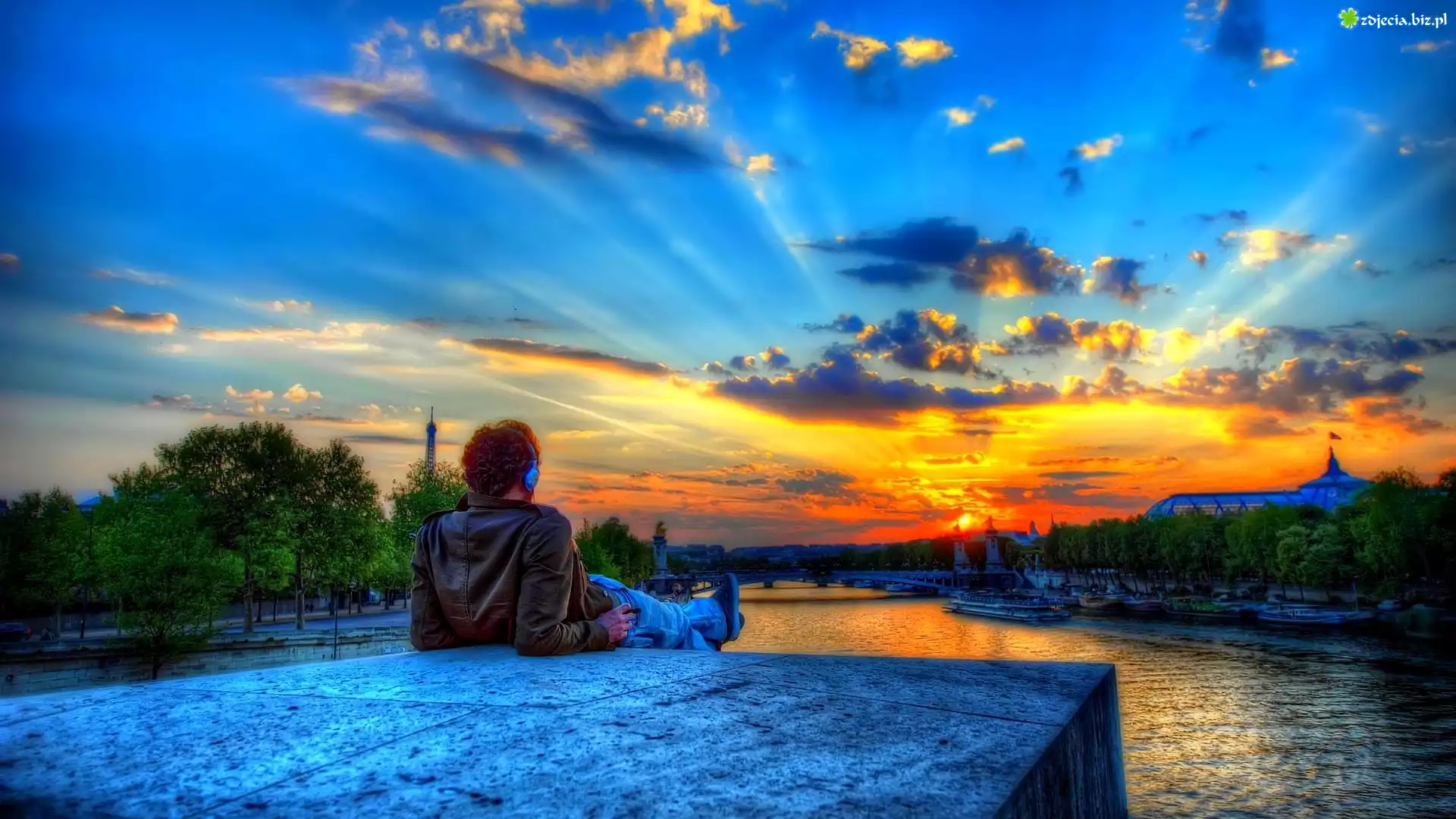 Zdjęcie Francja, Paryż, Rzeka, Zachód, Słońca, Mężczyzna